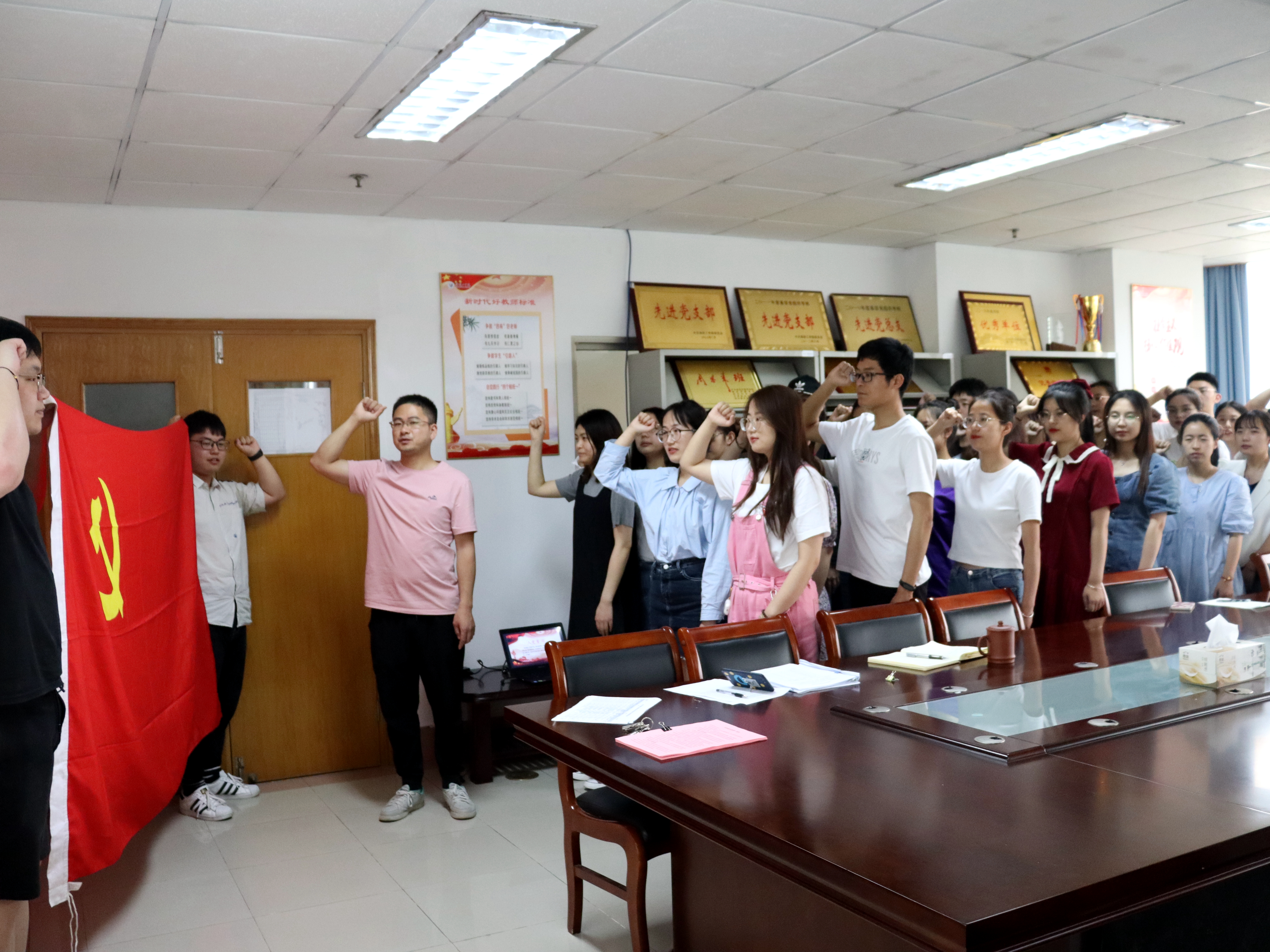 裴付伟带领全体毕业生党员面向党旗,举起右拳,重温入党誓词。