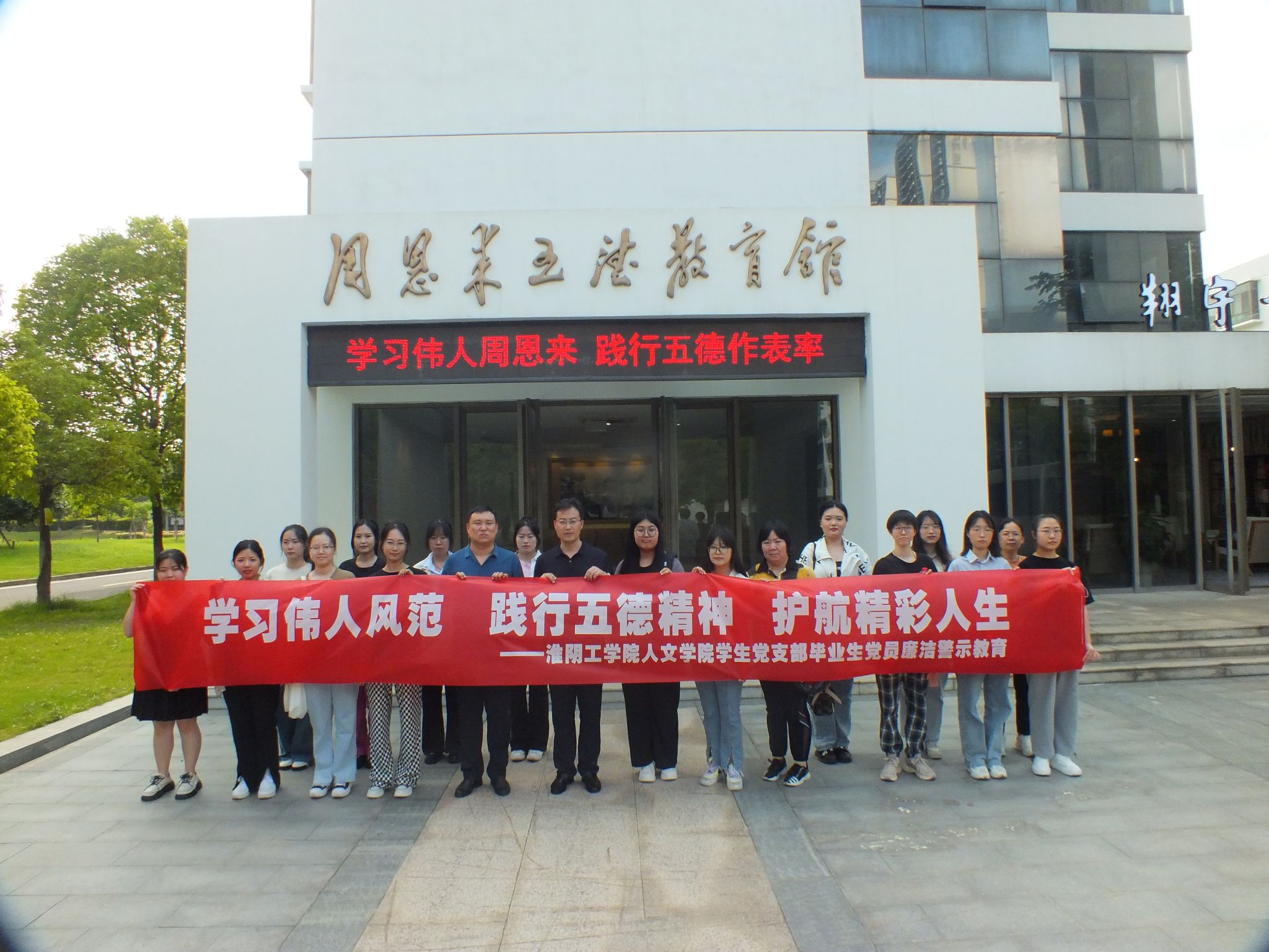 5月31日下午,支部带领毕业生党员走进周恩来“五德”教育馆,开展“学习伟人风范 践行五德精神 护航精彩人生 ”实境教育。通过馆内历史场景展现、实境教学,使场馆变课堂、素材变教材、讲解变对话,教育引导毕业生党员学习周恩来严于律己、宽以待人的高尚品德,争做坚守政治品德、谨守思想道德、恪守为政官德、遵守社会公德和信守家庭美德的表率。