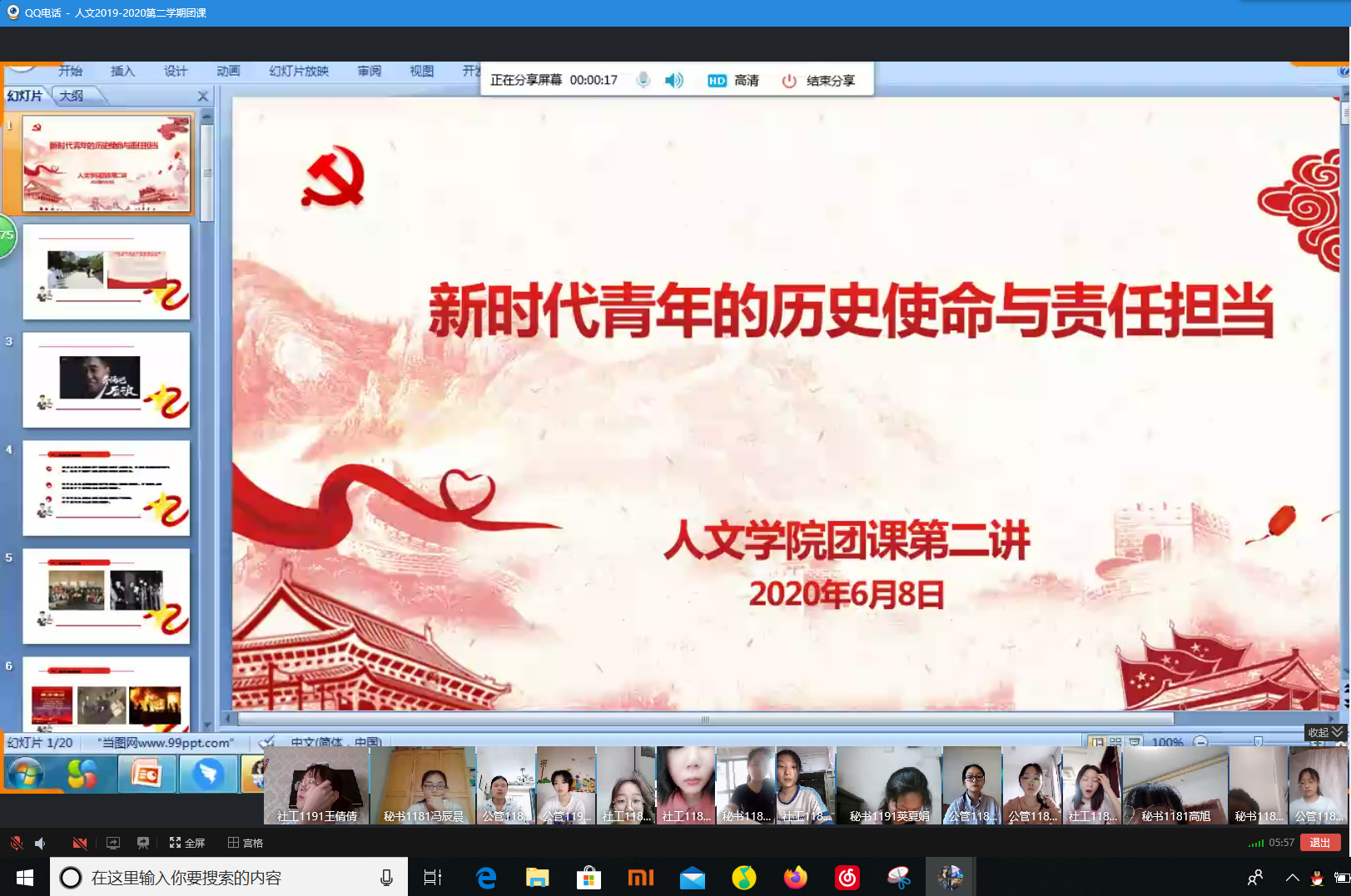为了提高公司共青团员的责任意识,更好地承担起当代青年的历史使命。XCsports于6月10日中午12:20,以QQ视频会议的形式,线上开展了主题为“新时代青年的历史使命和责任担当”的团课。本次团课由公司党务秘书颜彩媛老师主讲,团课全体学员参加。