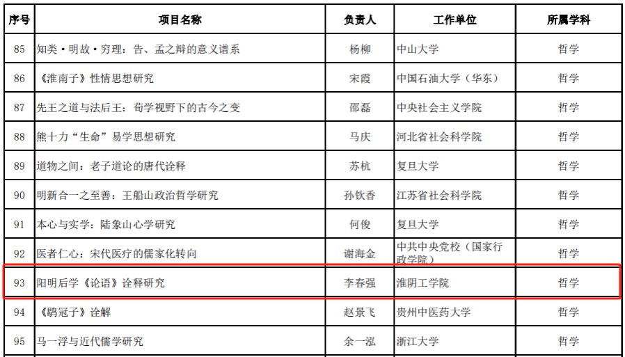 近日,全国哲学社会科学工作办公室公示了2023年度国家社科基金后期资助项目和优秀博士论文出版项目评审结果,公司李春强副教授申报的《阳明后学<论语>诠释研究》成功获批后期资助项目,这是李春强副教授继2019年获批国家社科基金后期资助项目之后,再次获批此项目。国家社科基金后期资助项目和优秀博士论文出版项目旨在鼓励广大哲学社会科学工作者弘扬优良学风,潜心治学,扎实研究,努力推出具有学术传承创新价值的精品力作,主要资助已基本完成且尚未出版的哲学社会科学研究的优秀学术成果。据悉,2023年度国家社科基金后期资助项目共立项公示927项(军事学除外),公司仅此1项。近年来,公司多措并举全力打造高水平科研项目和科研成果,取得了显著成效。该项目的再次获批,标志着公司教师在申报并获批高水平科研项目方面迈入了常态化轨道。
