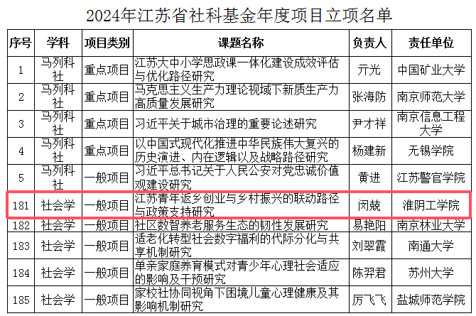 近日,江苏省哲社规划办公布了2024年度江苏省社科基金立项项目,公司闵兢博士申报的《江苏青年返乡创业与乡村振兴的联动路径与政策支持研究》成功获批一般项目。江苏省社科基金项目是江苏省人文社会科学领域最高等级的科研项目,分为重点项目、一般项目、青年项目三种类别。据悉,2024年度江苏省社科基金项目共申报2523项,立项444项,其中公司立项4项,均为一般项目。近年来,公司以科研机构和科研团队建设为平台和契机,鼓励教师在科研方面进行团队协作,不断加大对中青年教师的指导和培养力度,该项目的成功获批,说明公司对于中青年教师的培养举措取得了显著成效,也是科研机构和科研团队建设取得的又一项重要成果,再次证明公司教师在申报并获批高水平科研项目方面迈入了常态化轨道。