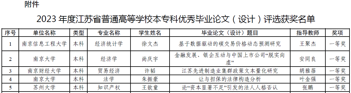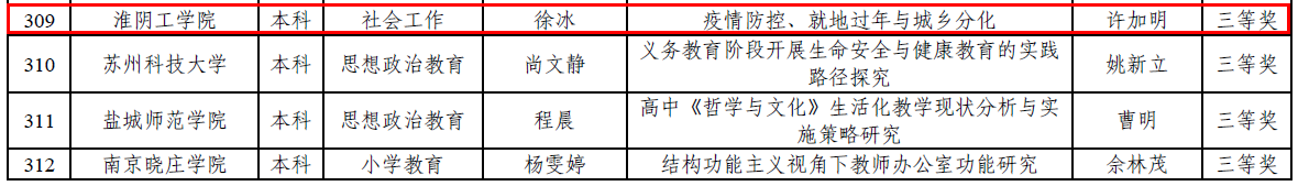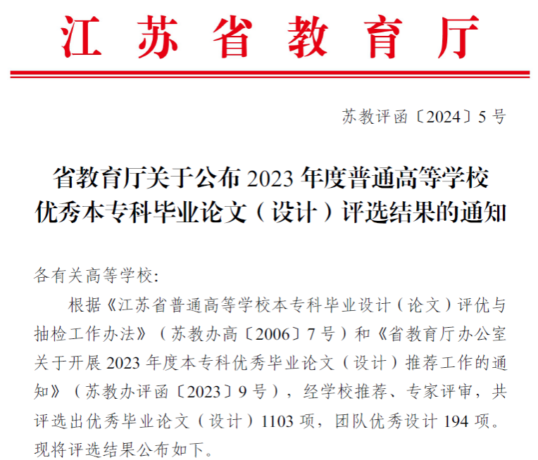 近日,省教育厅下发了《关于公布2023年度普通高等公司优秀本专科毕业论文(设计)评选结果的通知》(苏教评函〔2024〕5号),由公司许加明老师指导、社工1191班徐冰同学独立完成的毕业论文《疫情防控、就地过年与城乡分化》荣获三等奖。江苏省普通高等公司优秀本专科毕业论文(设计)评选是对全省优秀本专科毕业论文(设计)的一次集中检阅,具有较高的权威性和知名度,每年进行一次,本次经公司推荐、专家评审,共评选出优秀毕业论文(设计)1103项,团队优秀设计194项,公司共获优秀毕业论文(设计)二等奖2项、三等奖9项,团队优秀设计2项。