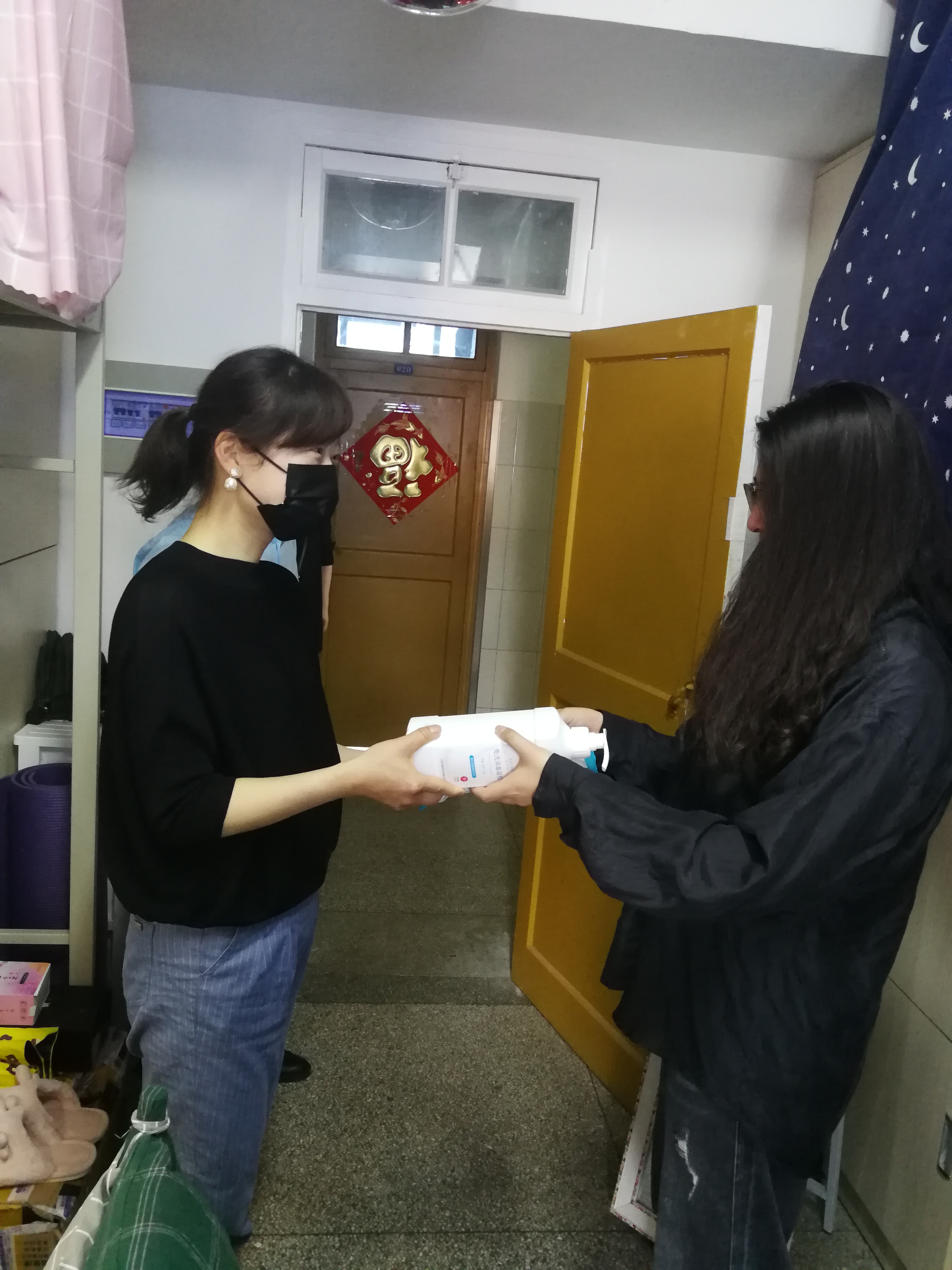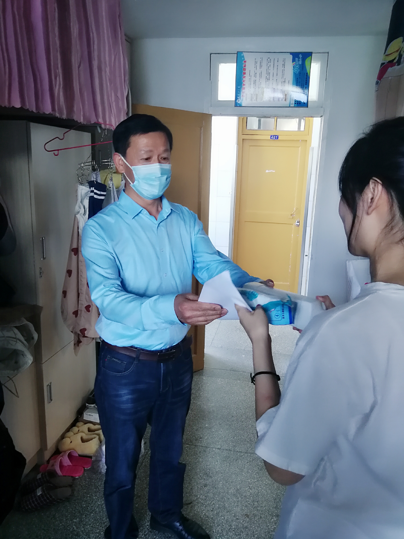 “同学家是哪儿的?” “现在在校生活上有没什么困难啊?”郁大海与返校员工亲切交谈,叮嘱同学们严格遵守防疫期间校园相关管理规定,加强个人安全防范意识,保持良好学习生活规律,鼓励大家克服疫情带来的影响,做到防疫学习两不误。随后,郁大海为员工送上含有免洗洗手液、额温枪等物资的“521爱心防疫大礼包”。
