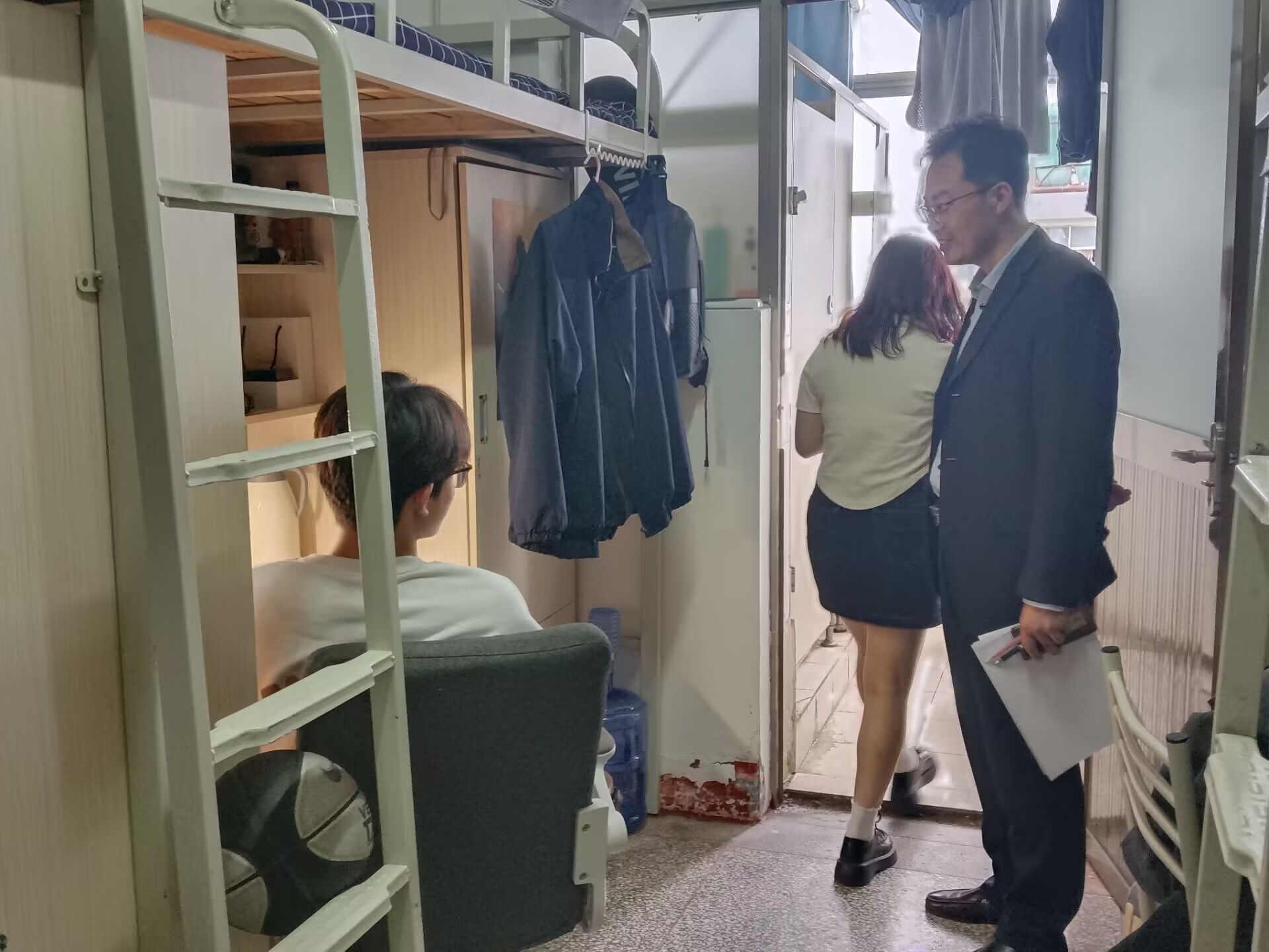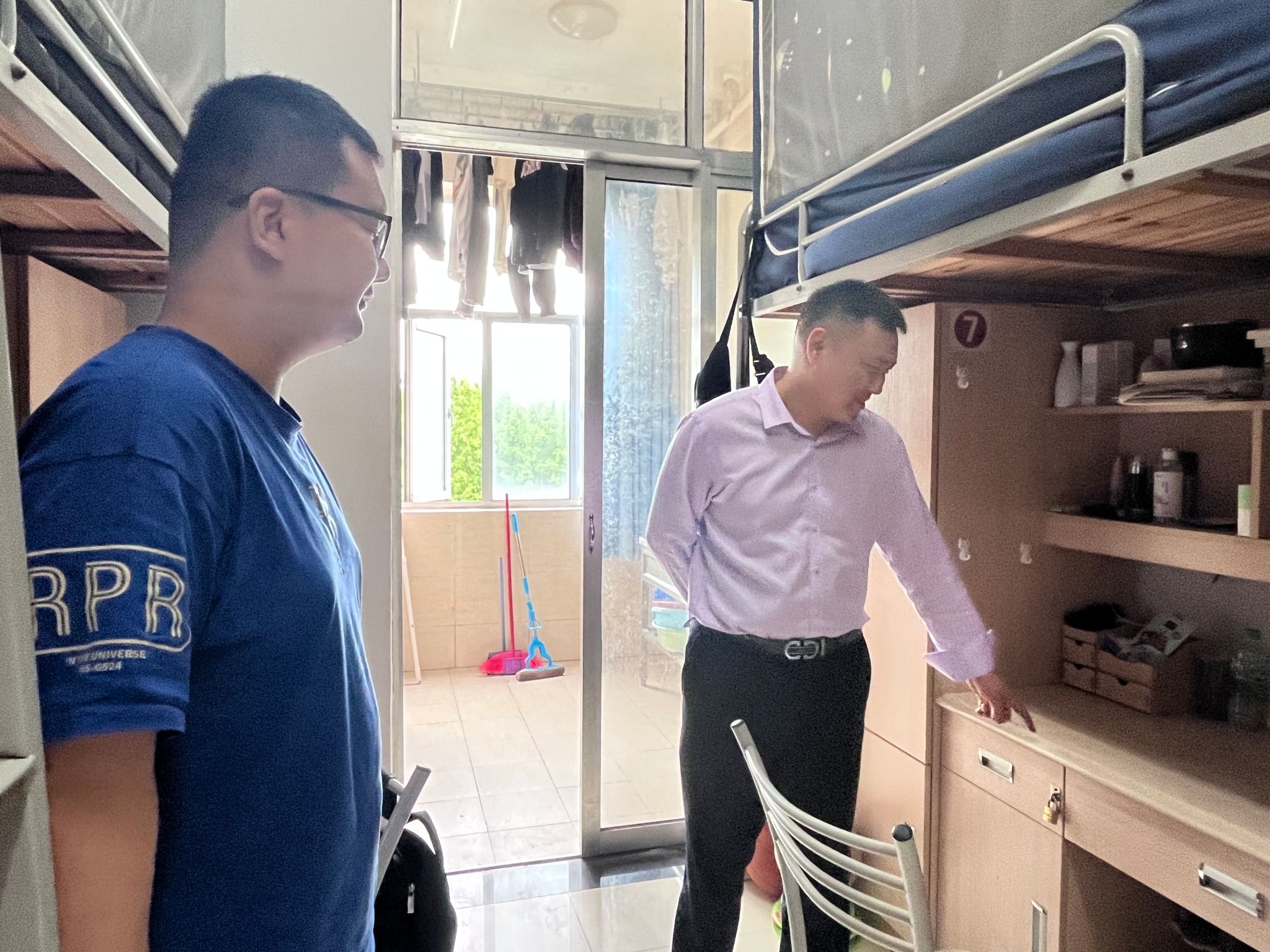 为贯彻落实公司安全稳定工作以及打通服务员工“最后一米”行动方案的有关要求,5月6日下午,公司党委副书记、副经理管永刚带领全体辅导员一起走进宿舍,走近员工,倾听员工,了解员工宿舍生活情况,关心员工学习近况,加强反诈宣传教育,督促检查宿舍安全与卫生,关怀员工成长困惑。