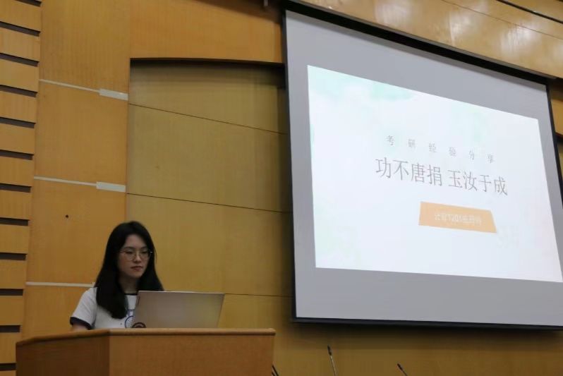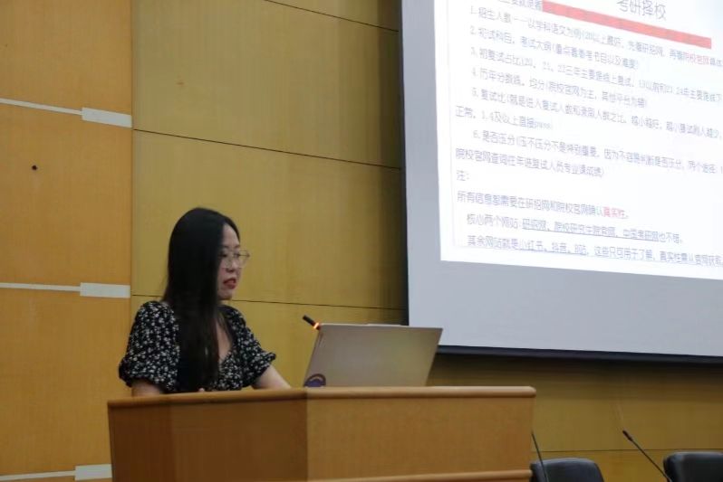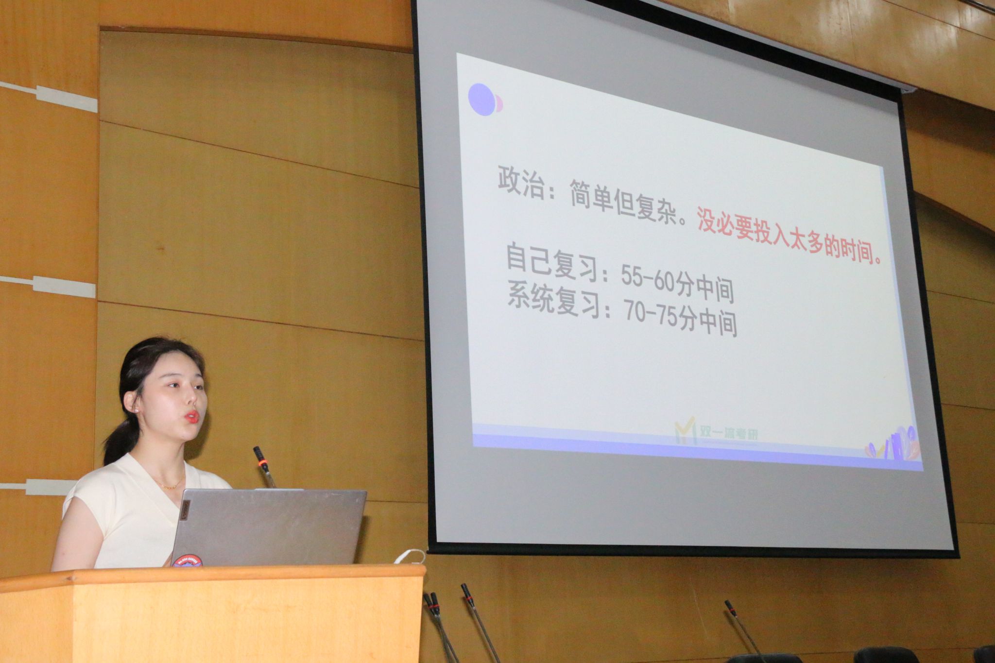 活动伊始,管永刚介绍本次会议的内容和目的,随后由考研讲师李依璐带领同学们了解考研相关知识,并从文科类专业如何高效备考、专业课高分资源的获取、目标院校难易程度分析、备考黄金期复习规划四个方面分析了考研方面的各种利弊。