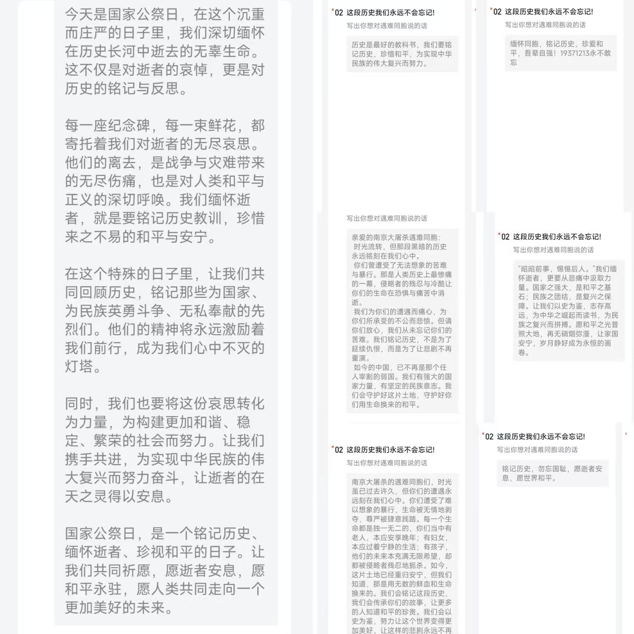 2024年12月13日,为纪念南京大屠杀死难者国家公祭日,缅怀在历史灾难中不幸遇难的同胞,同时激发同学们的爱国热情,传承和弘扬中华民族的精神。公司党委副书记管永刚、辅导员助理杭传利发起了一场线上留言活动。活动通过QQ群公告和群分享的形式广泛传播,吸引了众多员工的积极参与。