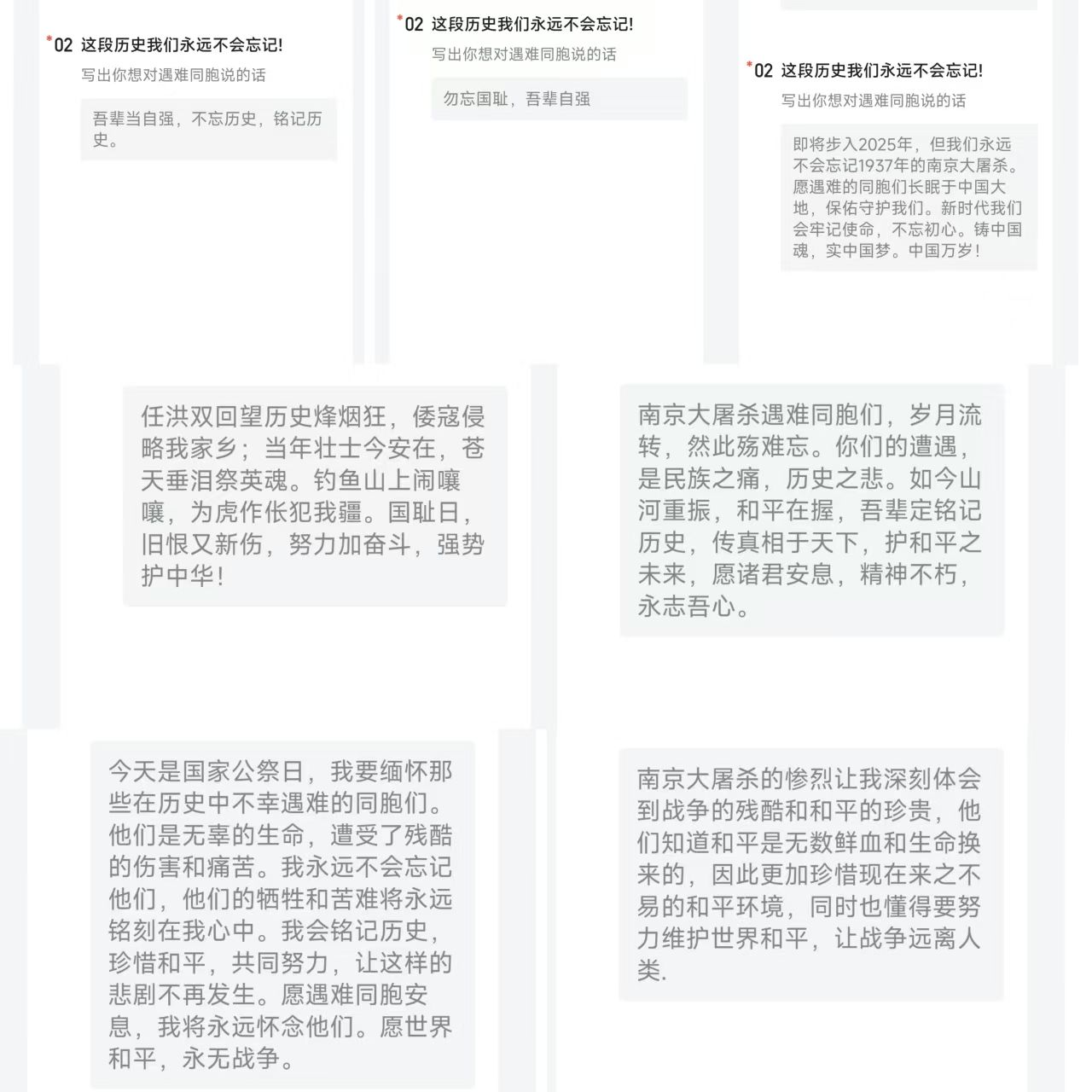 “铭记历史,勿忘国耻,愿逝者安息,愿世界和平。”一位同学在留言区深情地写道。另一位同学则表达了对未来和平与繁荣的坚定信念:“历史是最好的教科书,我们要铭记历史,珍惜和平,为实现中华民族的伟大复兴而努力。”