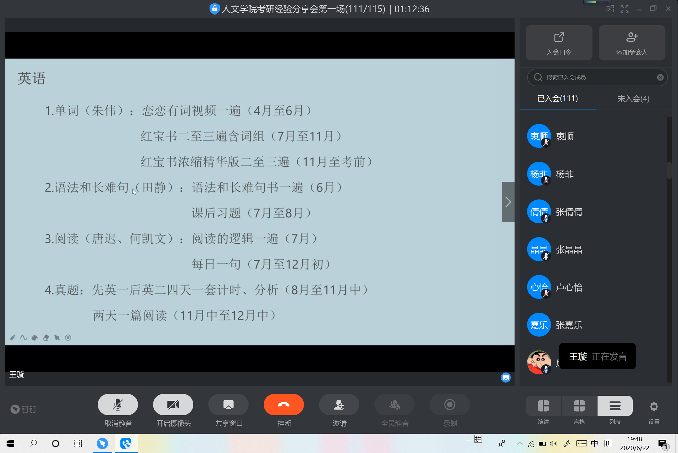 张倩倩同学从专业选择、复习过程、作息时间安排、心态调整四个方面介绍自己的考研经验。王璇同学在强调打基础的同时也强调心态的重要性。王晓晴与刘佳莲同学也从备考时间安排,复习建议,自己的经验教训为同学们介绍自己的考研经历。