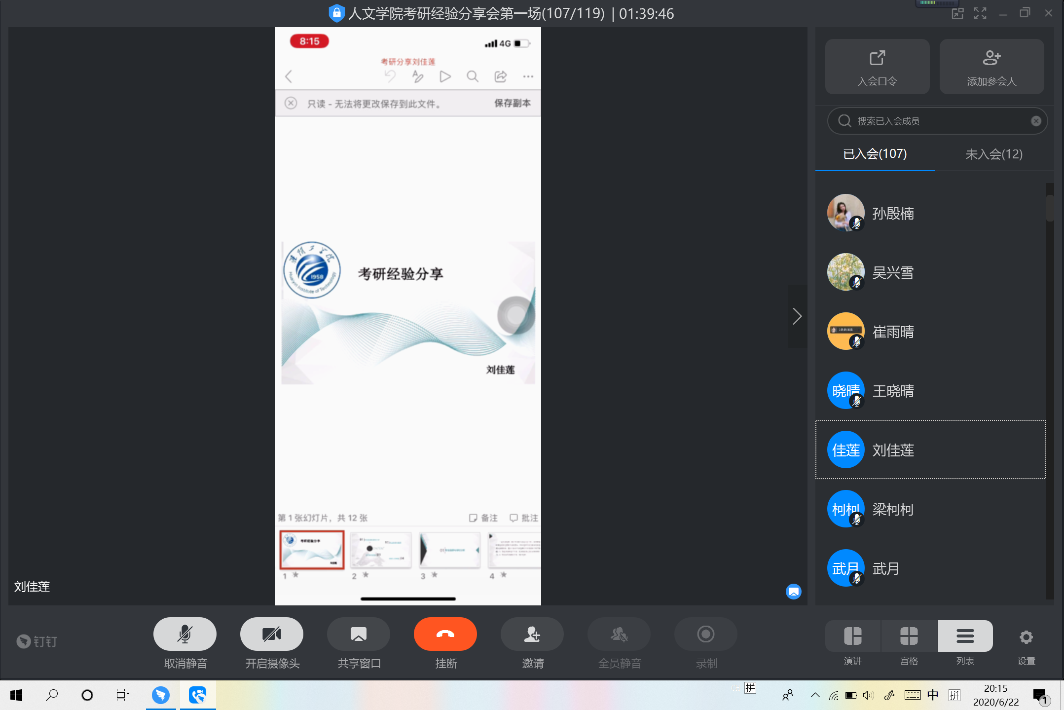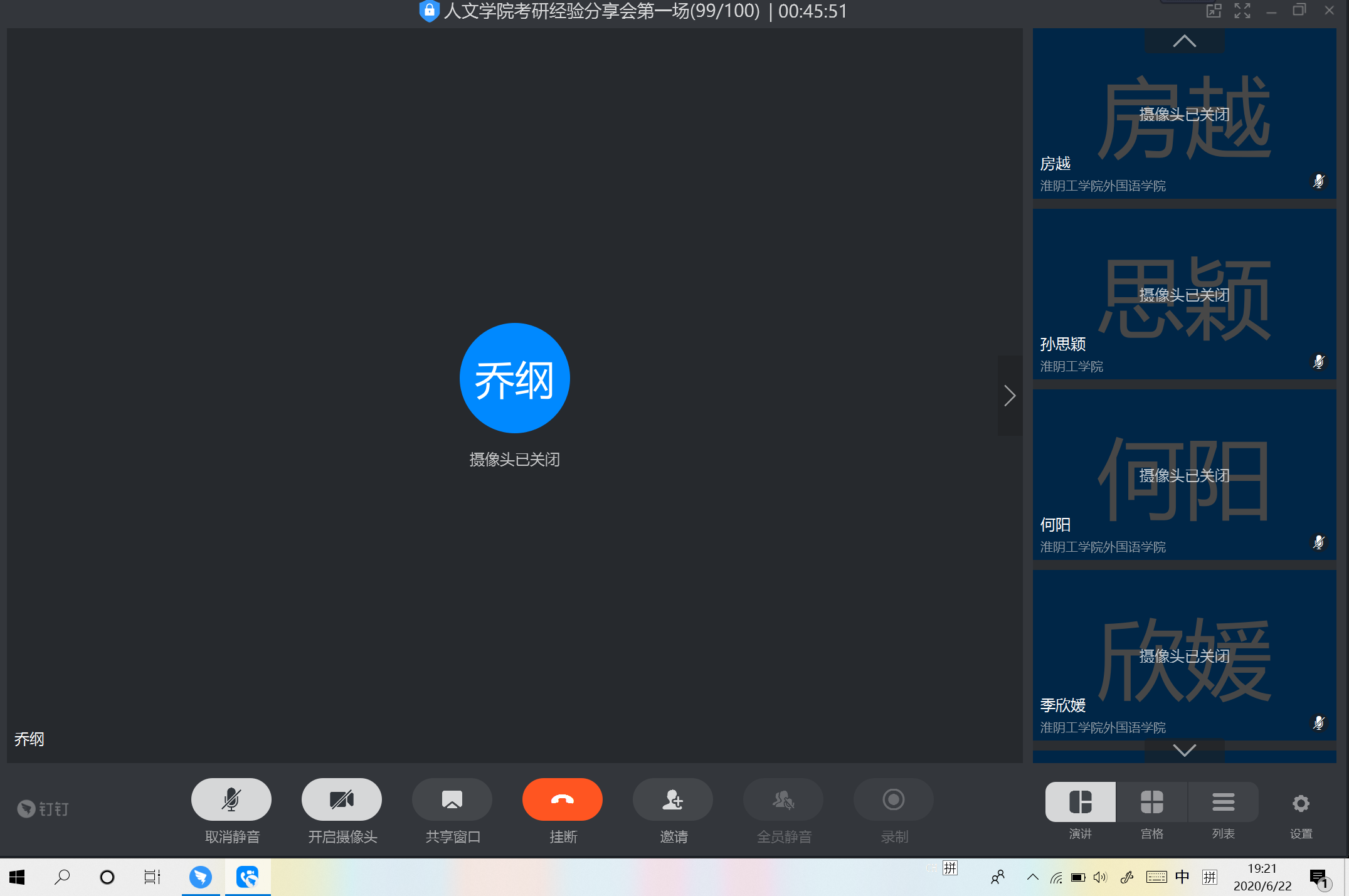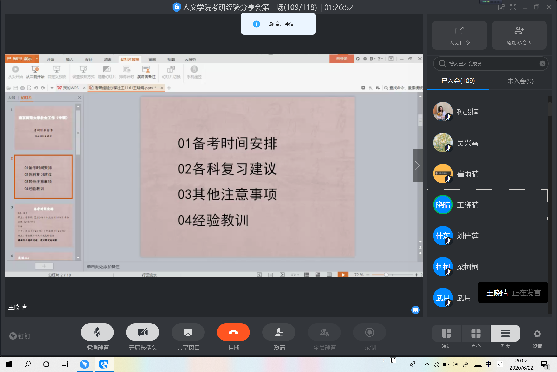 为了进一步激发同学的考研热情,明确考研目标,丰富考研经验和技巧。6月22日晚XCsports举行线上考研动员大会暨考研经验分享梦想公开课。本次动员大会诚邀社会工作专业乔纲博士和在20届考研中成绩优异、经验丰富的16级学姐张倩倩、王璇、王晓晴、刘佳莲分享经验、方法,公司党委副书记、副经理李晓慧、社工1171班主任林兴凤、公司全体辅导员以及17、18、19级社工专业同学参加,学工办主任杨晶主持了此次会议。