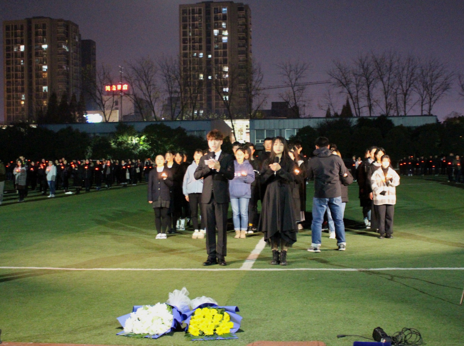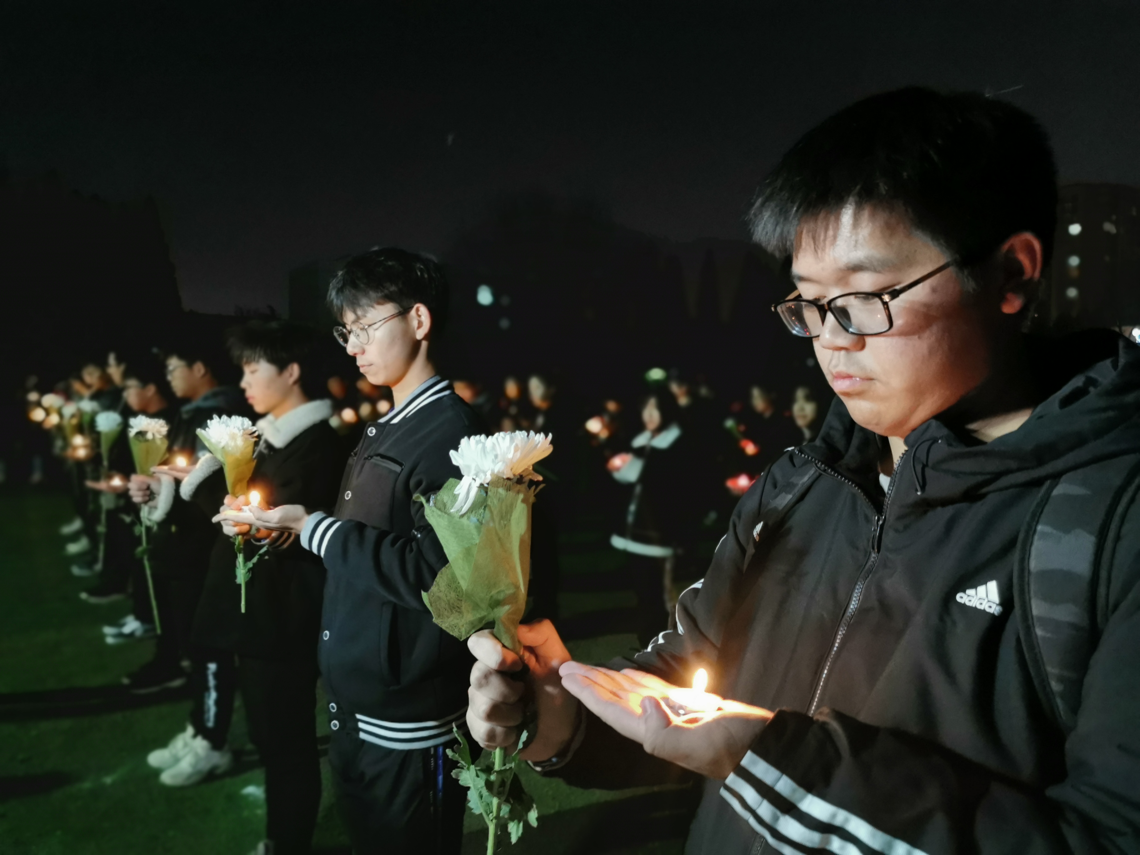 活动伊始,同学们手捧蜡烛。微弱的红光照亮斑驳的夜色,掀开了尘封许久的历史回忆。冷冽的寒风吹不灭跳动的烛火,就像中华民族的生命力,生生不息,源远流长。随后是朗诵和平宣言,由公司滕飞宇同学带领宣誓。伴随着庄严而神圣的誓词,那段壮烈的历史渐渐唤醒人们的记忆。"勿忘国耻,振兴中华!"这是我们每个人应该铭记于心的话语。最后,同学们迈出郑重而尊重的步伐,献出鲜花,表达崇高的敬意。