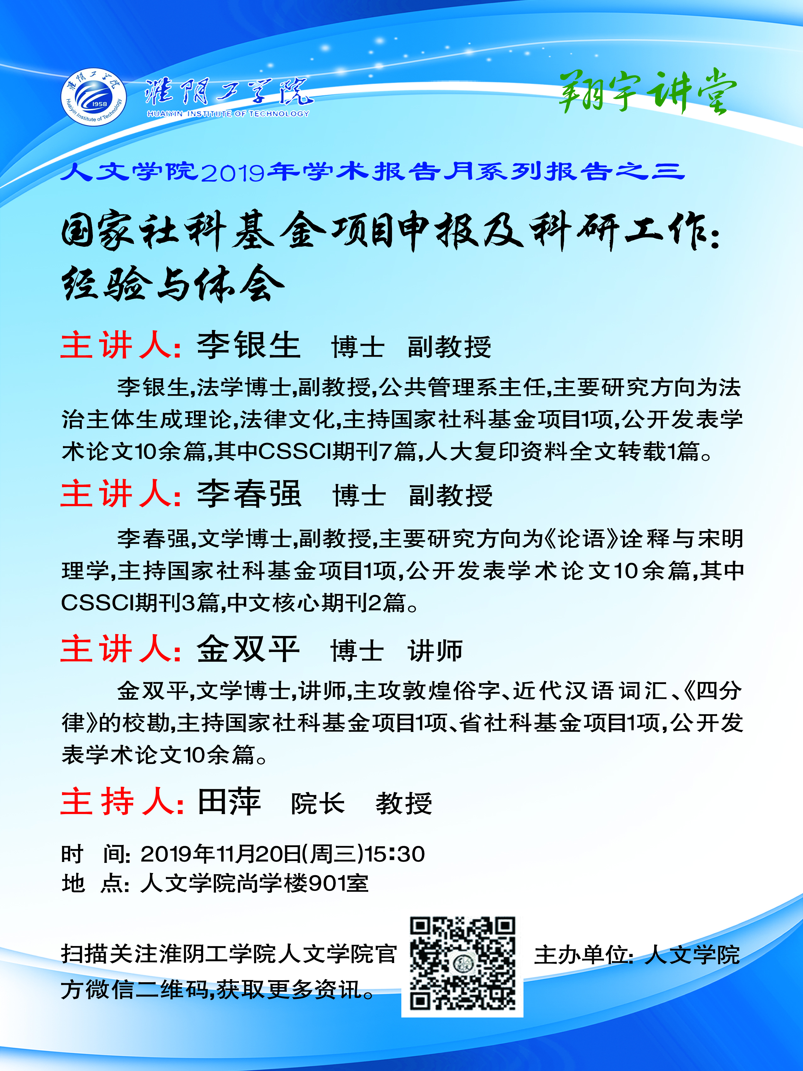 2019年学术报告月系列报告之三-----国家社科基金项目申报及科研工作:经验与体会