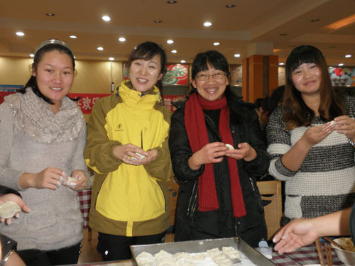下午4点整,包饺子活动在在六食堂二楼热热闹闹地开始了。在简单的布置后,到场的男生女生们纷纷捋起袖子,加入到包饺子的行列中。老师和学员一边包饺子一边聊天,气氛异常欢乐活跃。学员们别出心裁,包出的饺子形状各异,非常具有创造性。当一盘盘热气腾腾的饺子端上桌的时候,现场的气氛达到了高潮,大家吃着饺子,畅谈着各自的话题,其乐融融。