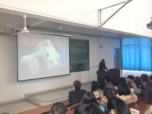 讲座开始之前,刘颖同学首先给大家看了刚发生的一起人身伤害事件的新闻报道。那就是长沙市五家岭街道办事处辖区内街头发生的一起砍人事件。然后,她又列举昆明火车站的“暴力事件”和“911事件”等例子。通过这些血淋淋的事实让同学们真真切切感受到恐怖分子的危害以及老员工掌握反恐相关知识的重要性。紧接着,她列举了一些发生在老员工之间的诈骗案件和校园诈骗案例,梳理了犯罪分子惯用的一些手段,讲述了几种常见的防诈骗方法,分析了诈骗防不胜防原因。以此提醒大家要时刻保持警惕,防止上当受骗。讲座的最后,刘颖同学还向大家讲解了关于消防、安全用电以及食品安全等方面的知识,希望老员工树立正确的安全观念。