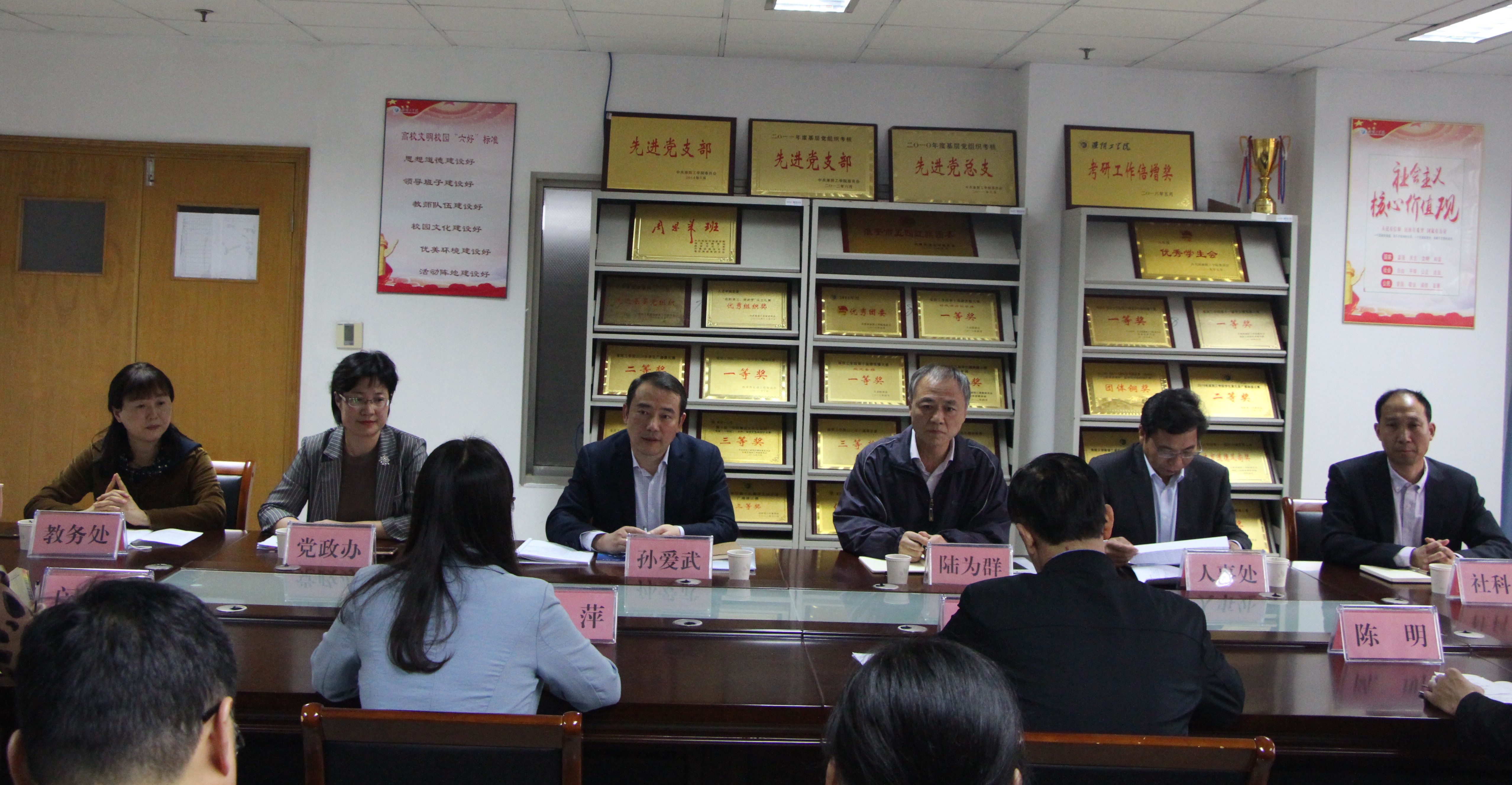 2020年10月15日下午,董事长孙爱武、副董事长陆为群率公司党政办、人事处、教务处和社科处等部门负责人深入公司调研指导。15时,调研会在院会议室举行。会议首先听取田萍经理的信息工作汇报和郁大海书记的党务工作汇报,随后教务处赵玉萍、党政办翟明女、社科处史修松、人事处孙全平等分别就部门业务对公司工作加以指导,副董事长陆为群对公司各项工作给予充分肯定,并建议公司应主动探索可持续发展的问题。最后孙爱武做了总结发言。