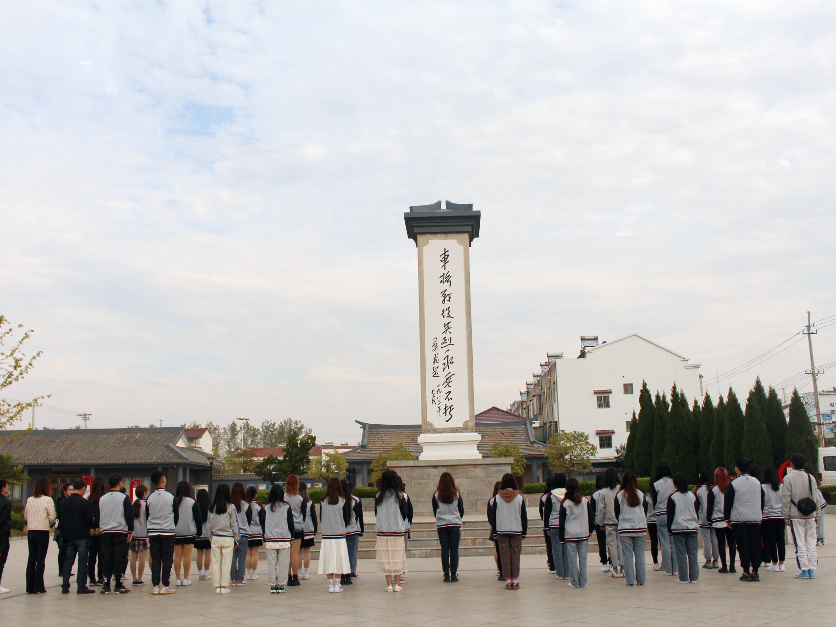 青山埋忠骨,史册载功勋。走进车桥战役纪念馆,一座气势雄伟的烈士纪念碑就映入同学们眼帘,上面由叶飞同志手写的“车桥战役英烈永垂不朽”几个大字刚劲有力,在暖阳下熠熠发光。同学们怀着庄严肃穆的心情面向纪念碑三鞠躬,表达对革命先烈的深切哀思和崇高敬意。