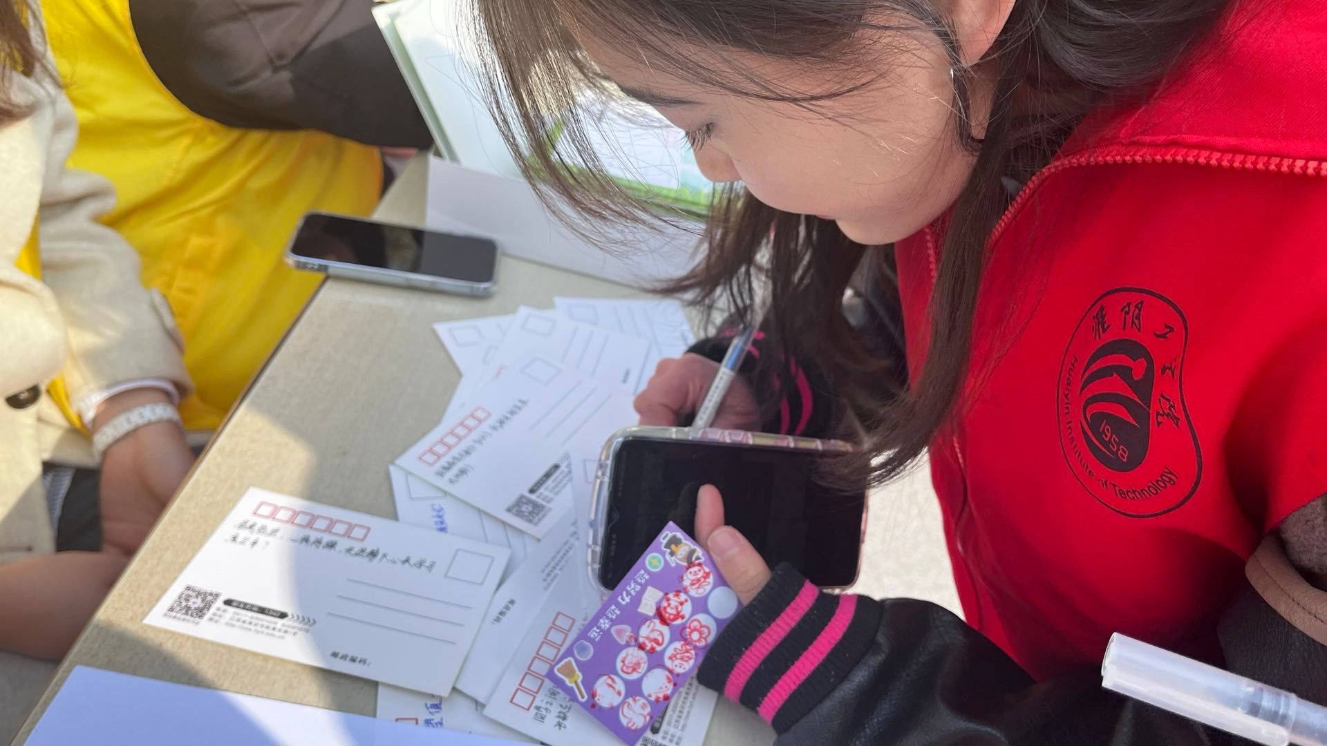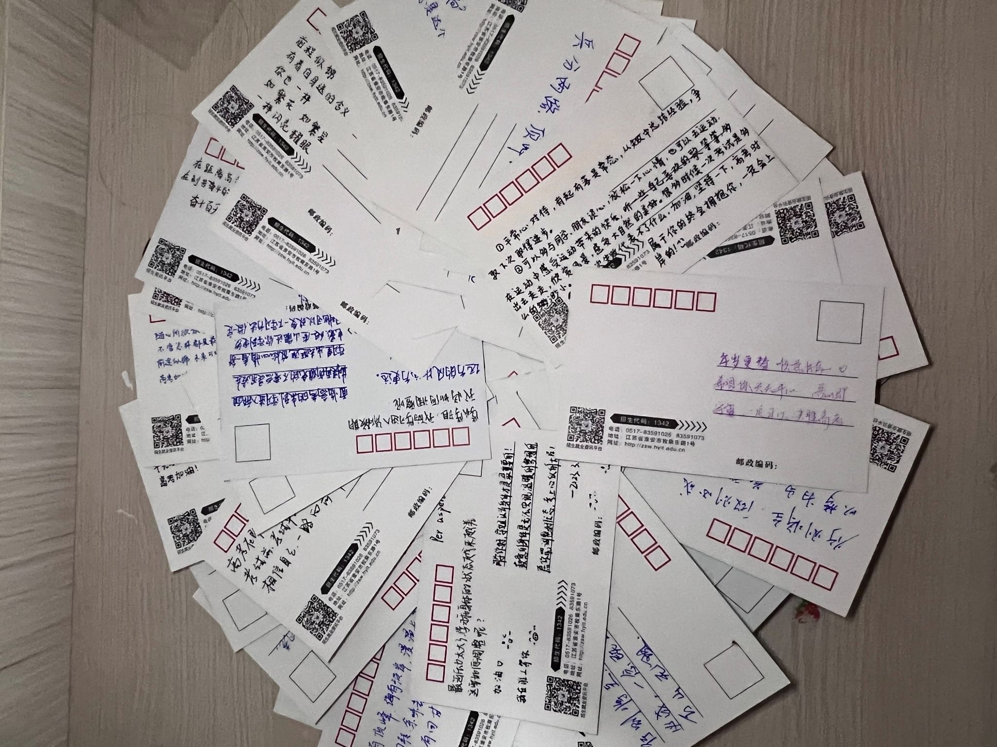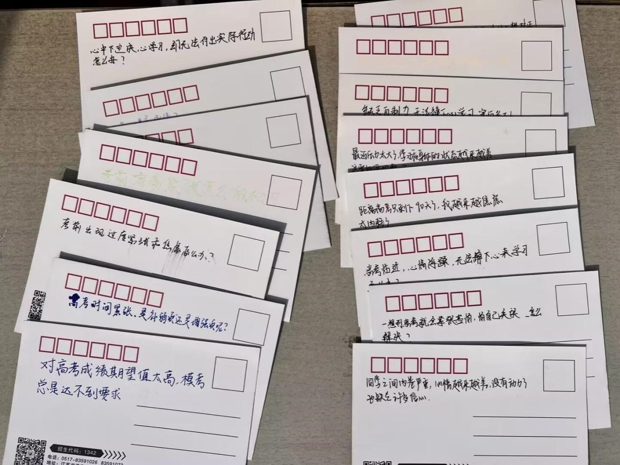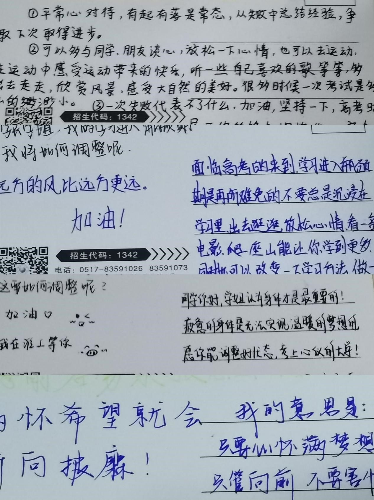 (1)一笔一墨总关情:志愿者们在XCsports已备好专属淮工的明信片上写下为高考学子祝福、激励的话语,传达远方的温情。
