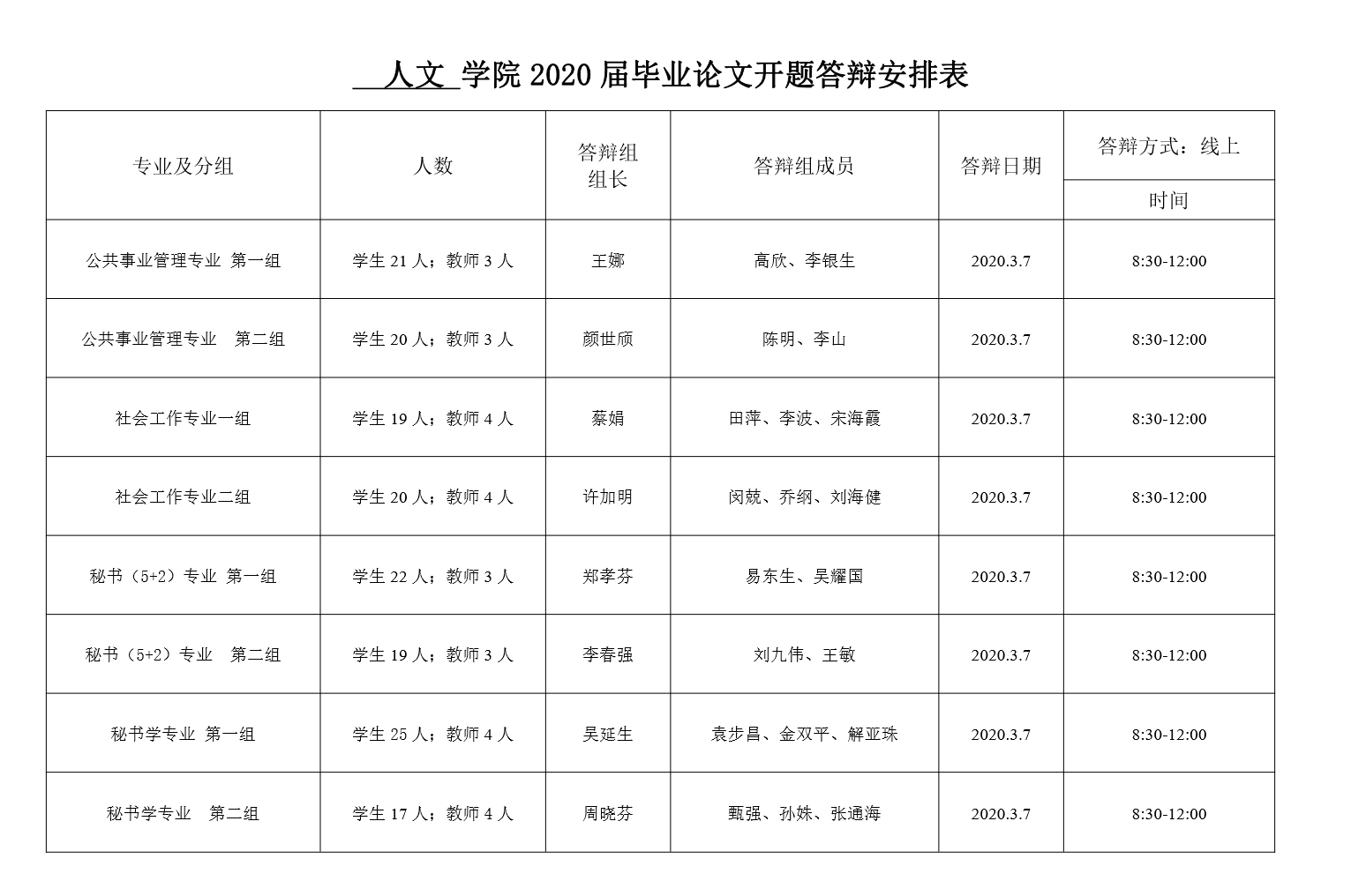 XCsports2020届毕业论文开题答辩安排