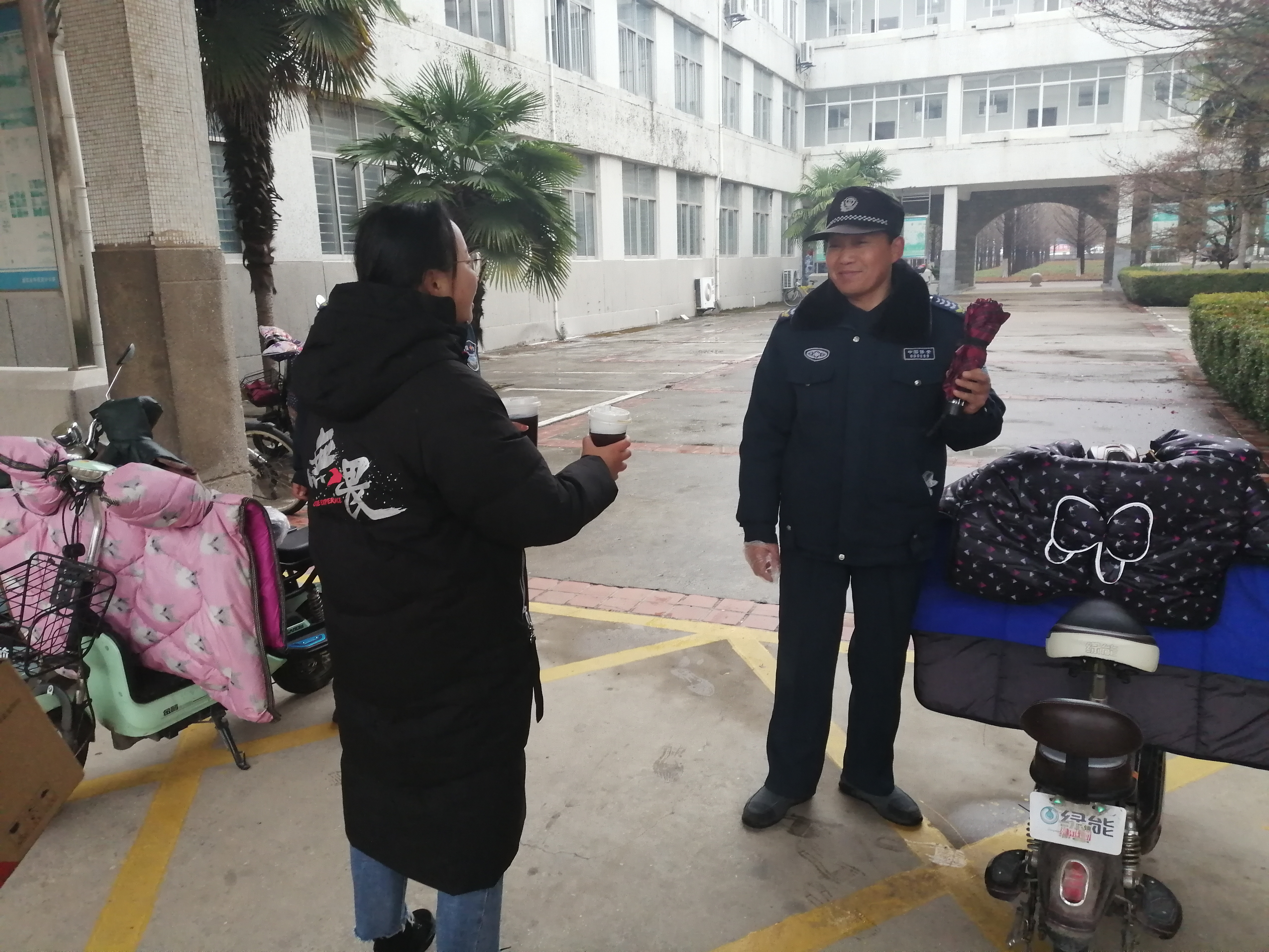 “当我们在温暖的室内吹着空调时,却有一群人仍坚守在严寒中,为保障每位同学的安全而努力工作着,希望我们的姜茶能在寒冷的冬日为他们带来一丝温暖。”这些姜茶是XCsports一米阳光的志愿者们提前购买好生姜、红糖、红枣,经过三四个小时熬制出来的。装了满满几个保温桶,为北京路校区的几十位叔叔阿姨送去温暖。