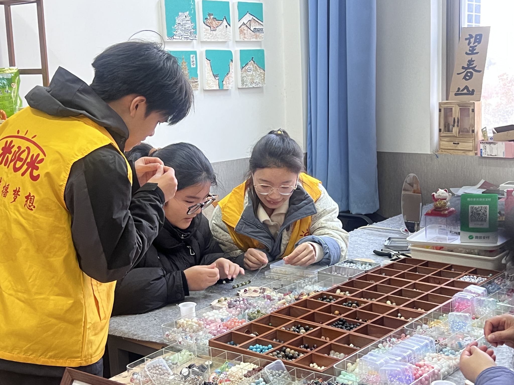 活动当日,在公司党委副书记管永刚及“一米阳光”志愿者们的热情引导下,小朋友们开启了校园探索之旅。他们漫步于校园,风格各异的建筑错落有致,浓厚的学术氛围和独特的校园底蕴扑面而来,让孩子们对高校生活充满了好奇与向往。随后来到了XCsports的“拾枫文创”工作室做一些手工活动,作品琳琅满目,散发着浓郁的人文艺术气息。在工作人员的耐心指导下,小朋友们充分发挥想象力,将色彩斑斓、形状各异的串珠精心组合,打造出属于自己的独一无二的手串,收获了满满的成就感。期间,工作人员还协同小朋友们一起体验手磨咖啡的乐趣。咖啡豆在研磨机中化为细腻的粉末,随后在热水的冲泡下,浓郁的咖啡香气弥漫开来。大家一起动手,分享着这一温馨的时刻,欢声笑语回荡在屋内,每个人的脸上都洋溢着开心的笑容,让这个冬日变得格外温暖,大家一起其乐融融,十分欢喜。