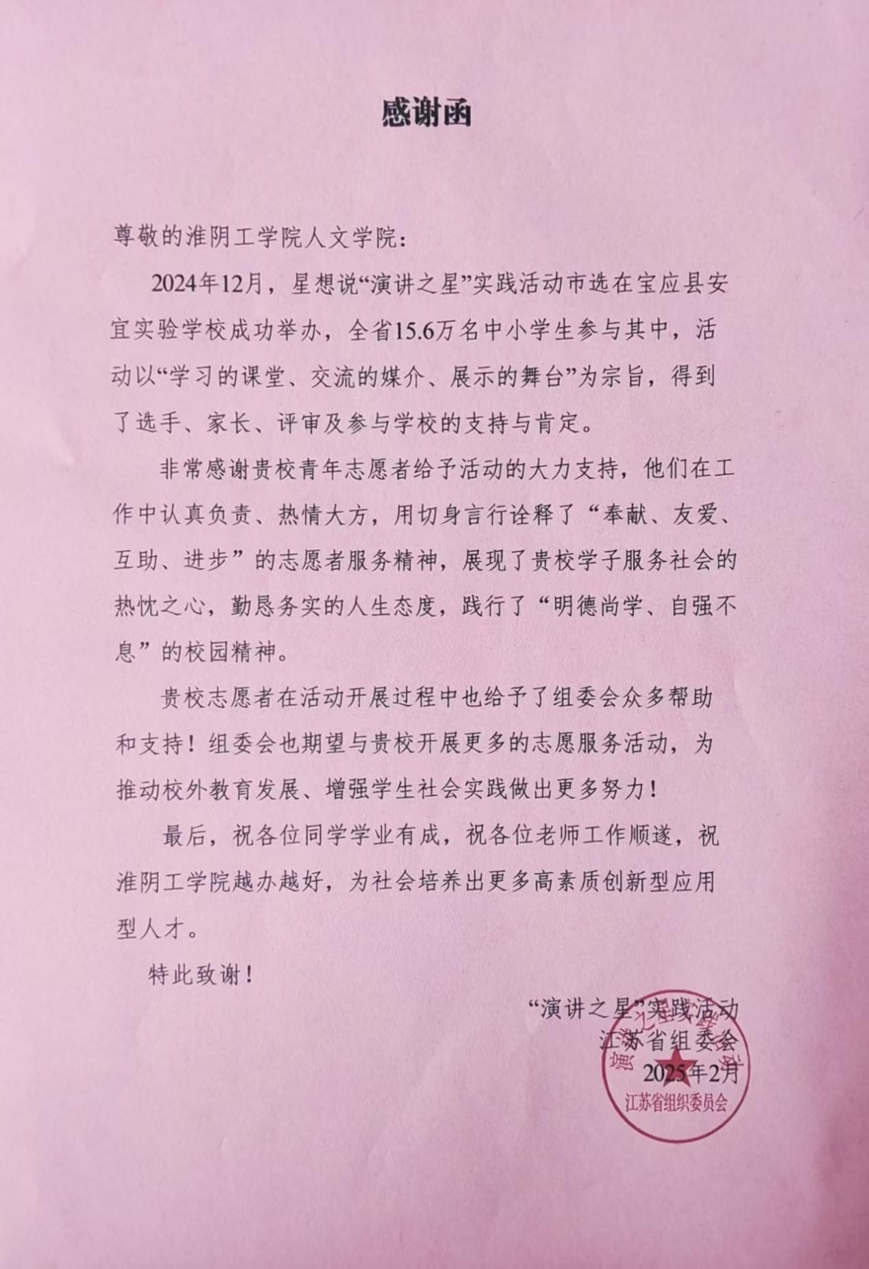 活动结束后,“演讲之星”实践活动江苏省组委会特发来感谢函,高度赞扬公司志愿者“认真负责、热情大方”的表现,充分肯定其践行“奉献、友爱、互助、进步”的志愿精神,并特别提及志愿者们“勤恳务实的人生态度”与“服务社会的热忱之心”,为活动成功举办提供了坚实保障。这份认可不仅是对公司青年学子能力的嘉奖,更是对XC体育“明德尚学、自强不息”校园精神的生动体现。