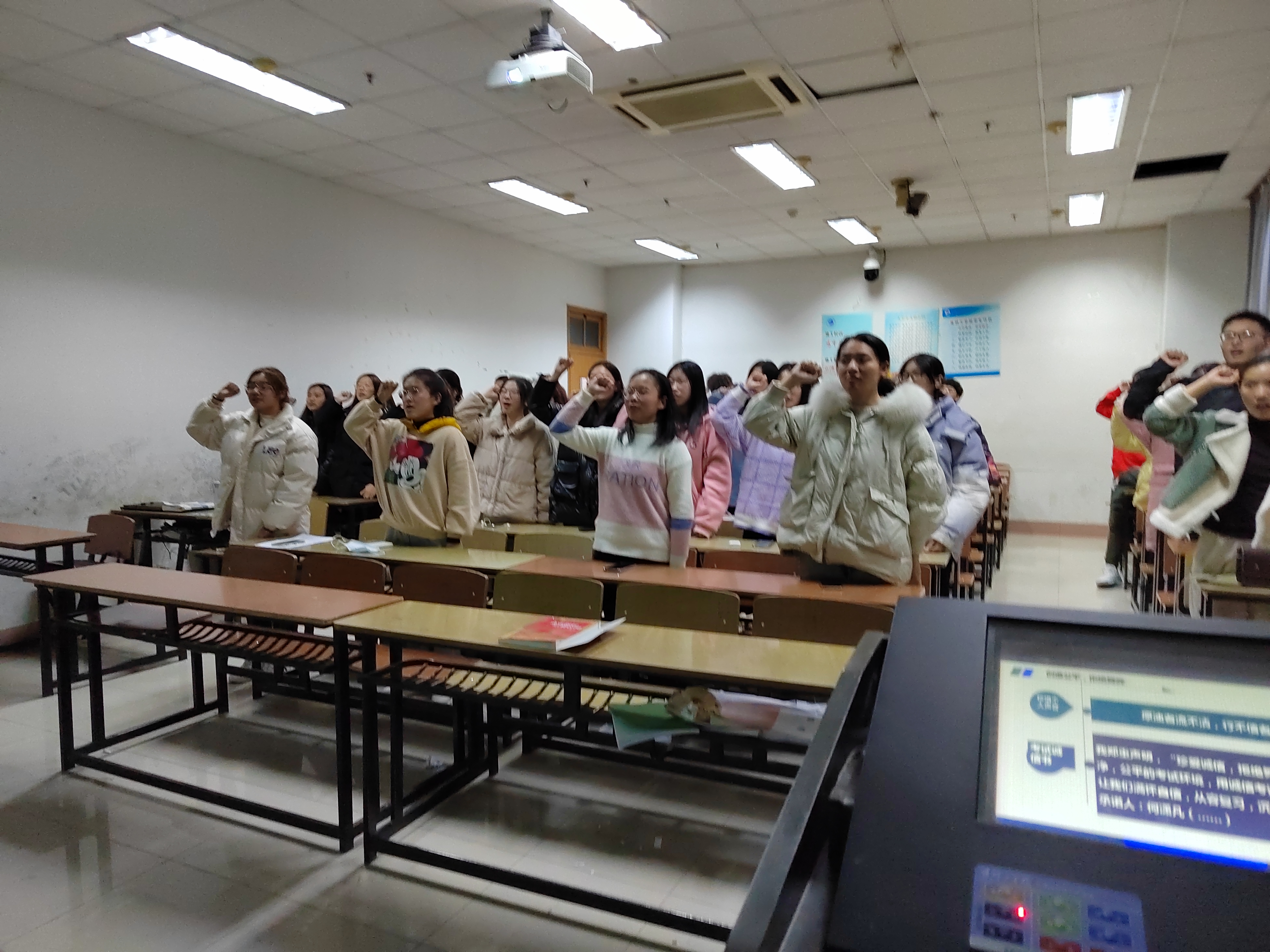随后大家一起观看了杜绝考试舞弊的宣传视频,何潇凡同学带领大家郑重声明,“珍爱诚信,拒绝舞弊”,为营造洁净,公平的考试环境,用诚信考试构筑诚信人生。让我们满怀自信,从容复习,沉着应考,冷静作答。”