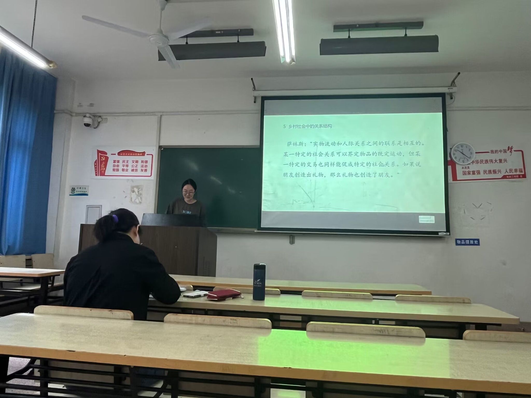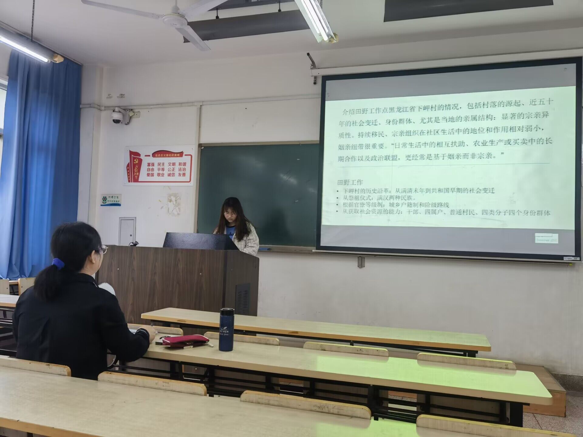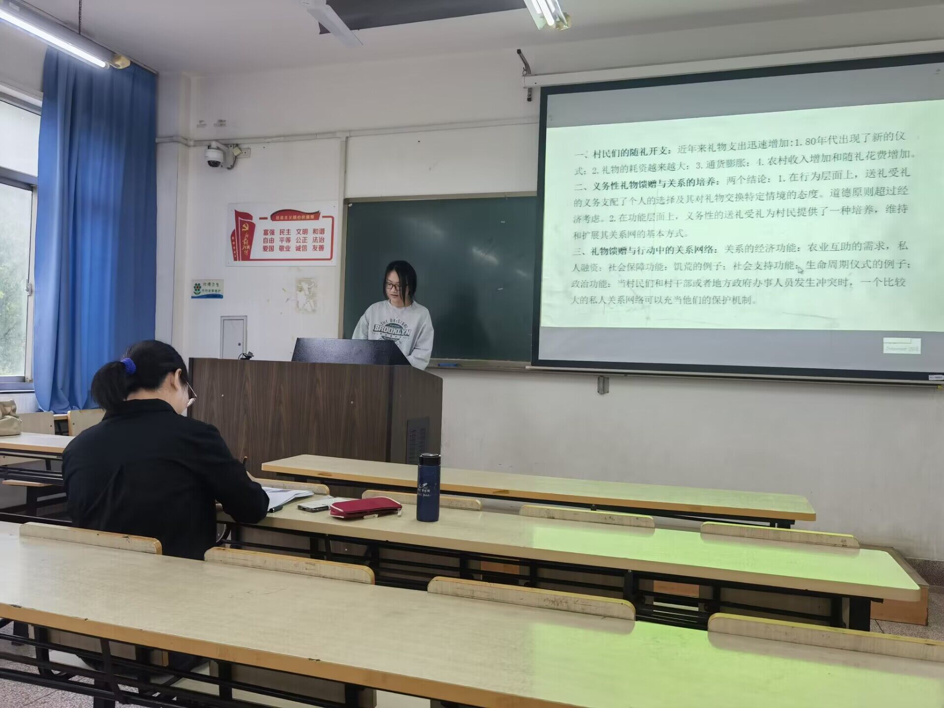 尚文萃首先对该书的写作缘起、作者阎云翔个人身世以及学术成就和该书的学术价值进行了简单的介绍,然后梳理了该书的逻辑框架以及主要内容。其他8位同学根据个人阅读兴趣以及生活经历对该书进行了分享。同学们在分享过程中最感兴趣的是三点内容:一是乡村社会关系网络与礼物馈赠;二是礼物馈赠的规则与人情伦理;三是礼物交换关系中的权力与声望。同学认为阎云翔做田野调查的下岬村的随礼原则与其个人常识非常一致,虽然反映的上世纪八九十年代的东北农村的人情往来,但是对于认识或者说解读当前的中国社会关系还是具有指导意义。