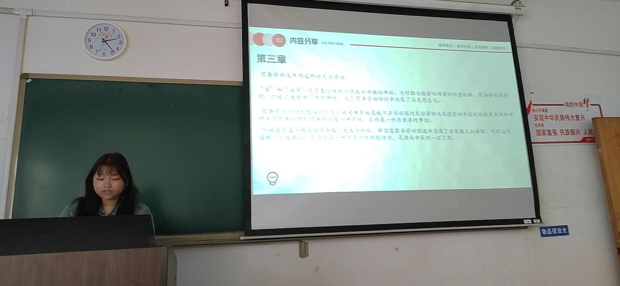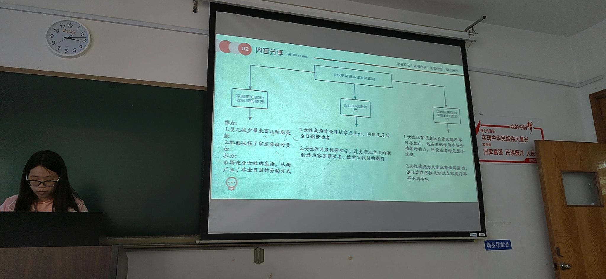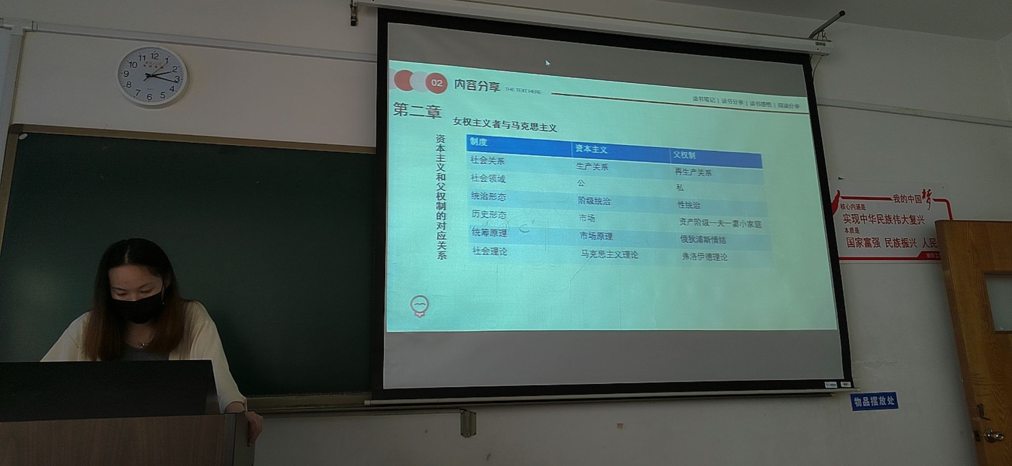 杨青通过介绍作者简介和本书内容背景为开始,接着汇报第一章和第二章的内容感悟。首先介绍第一章马克思主义女权的问题建构,主要阐述了女性受压迫的一些女权主义解放理论,均建立在马克思主义及其反论或修正的基础上。在介绍完理论内容的基础上,杨青汇报了马克思主义女权的建立过程。从马克思主义将近代工业社会中阶级统治的历史固有形态命名为"资本主义",到女权主义者将资产阶级一夫一妻制家庭中所产生的性统治的历史固有形态命名为"父权制"。杨青得出以下总结:一、马克思主义女权主义是以女权主义的视角对马克思主义的重读。它既不同于阶级统治一元论,也不同于性别统治一元论,它重在将市场和家庭相结合来解读女权主义。二、马克思主义女权主义是结合了马克思主义的女权主义,两者是并集关系而非隶属关系。三、解放的思想需要解放的理论。缺乏理论的思想只会陷入教条主义。宣称女性解放不需要理论的人,会被封闭在反智主义的牢笼中。