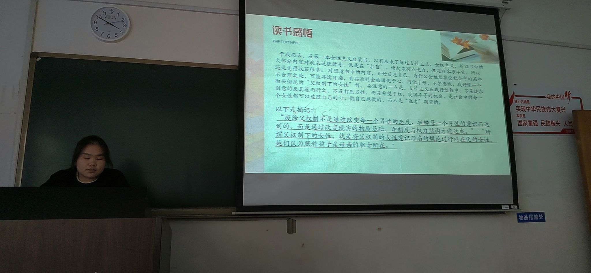 5月31日下午两点社工1211班级进行第五次简里·三到读书分享活动。本次读书汇报主题为《父权制与资本主义》,参与本次读书汇报活动的共有7位同学同学:应洁、 杨青、谢梓琳、王恋、刘利利、包嵘、龙立娟。主持人———应洁同学对于《父权制与资本主义》一书的写作背景、主要内容和写作者个人生平作了简要介绍后,然后其他同学根据个人阅读兴趣与感悟进行了读书分享。