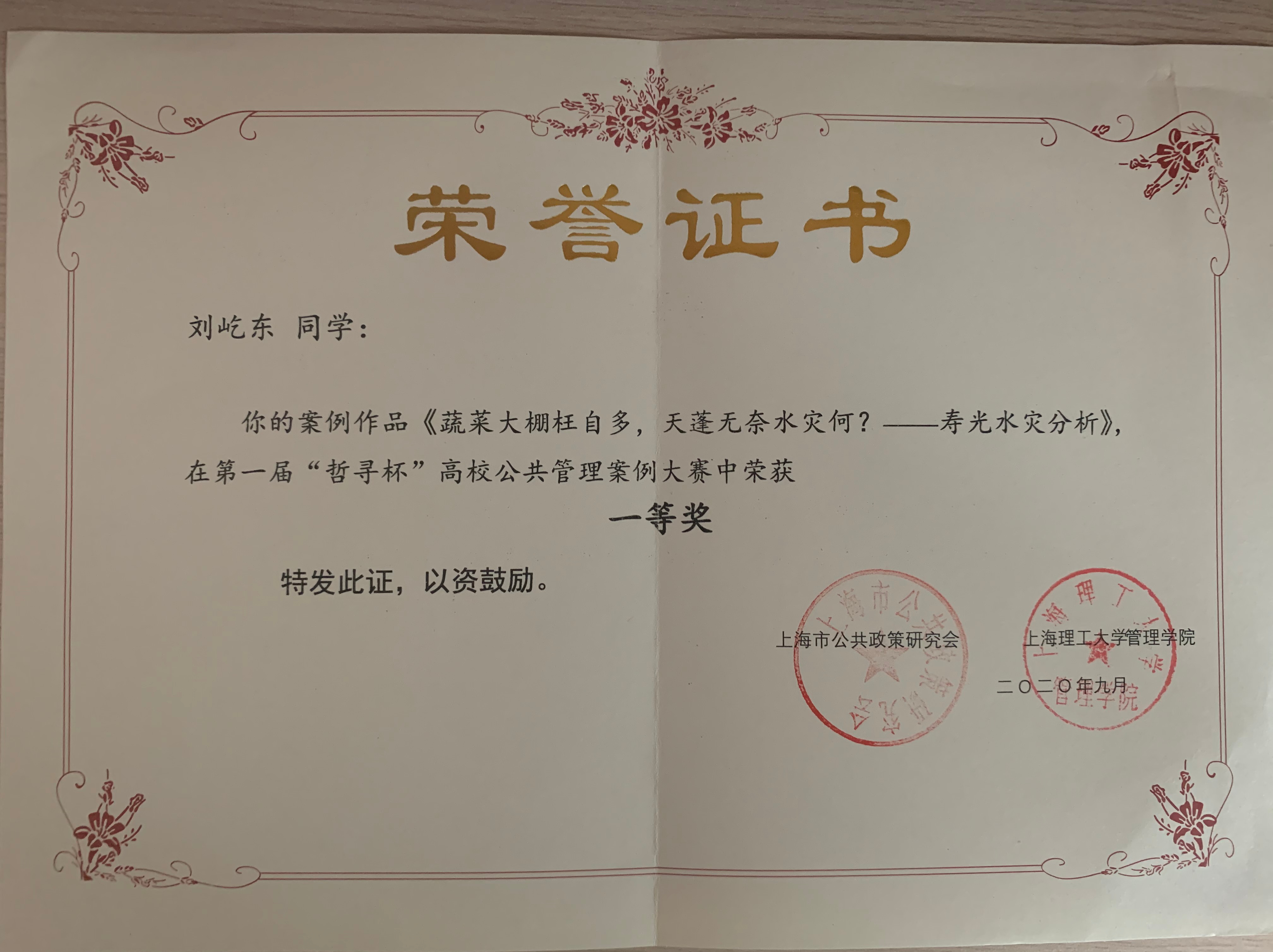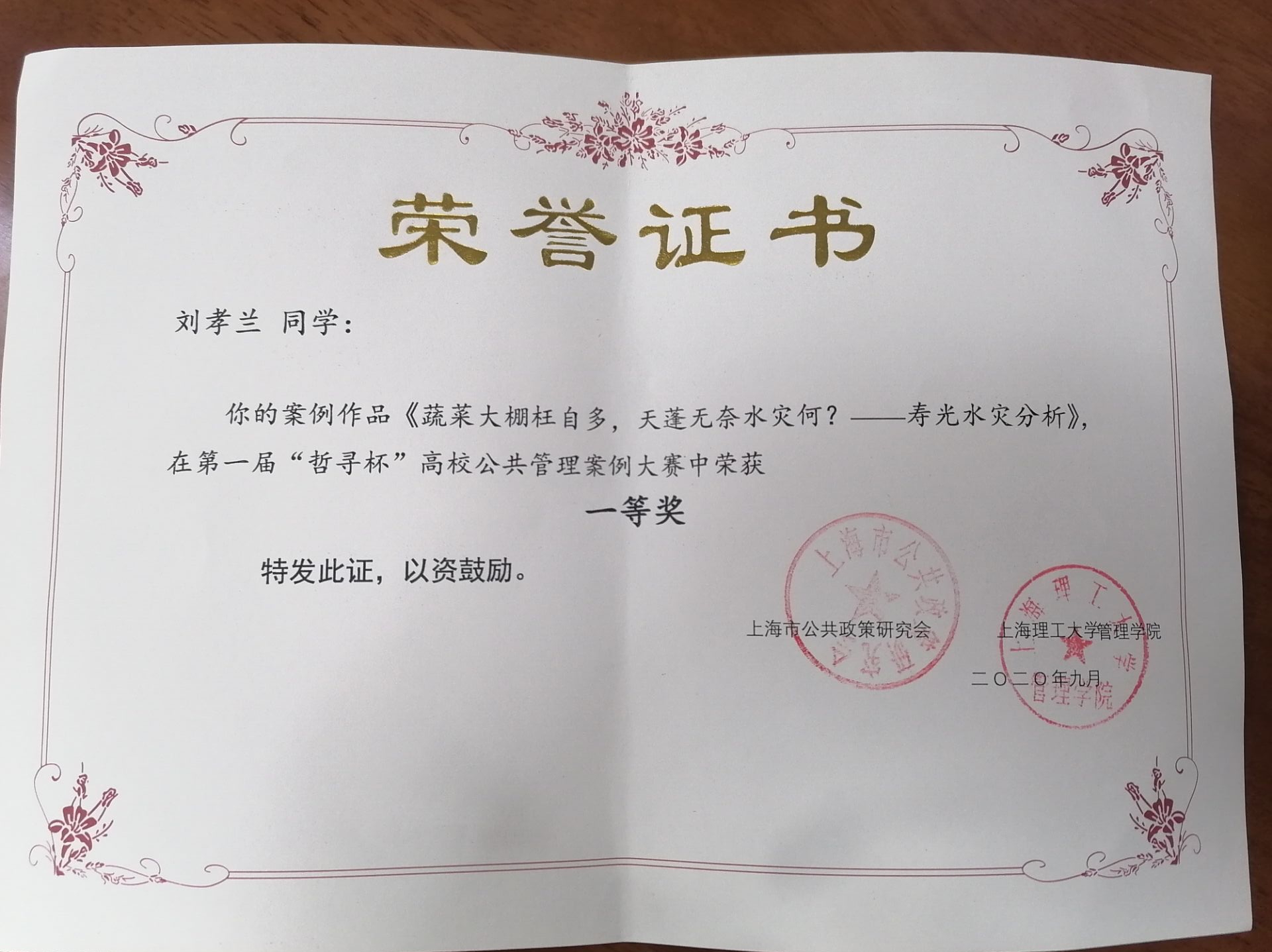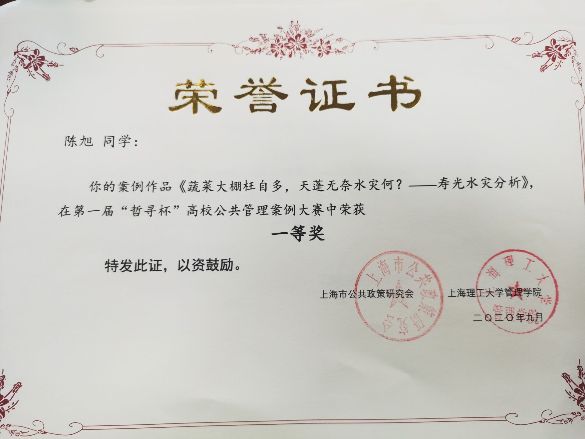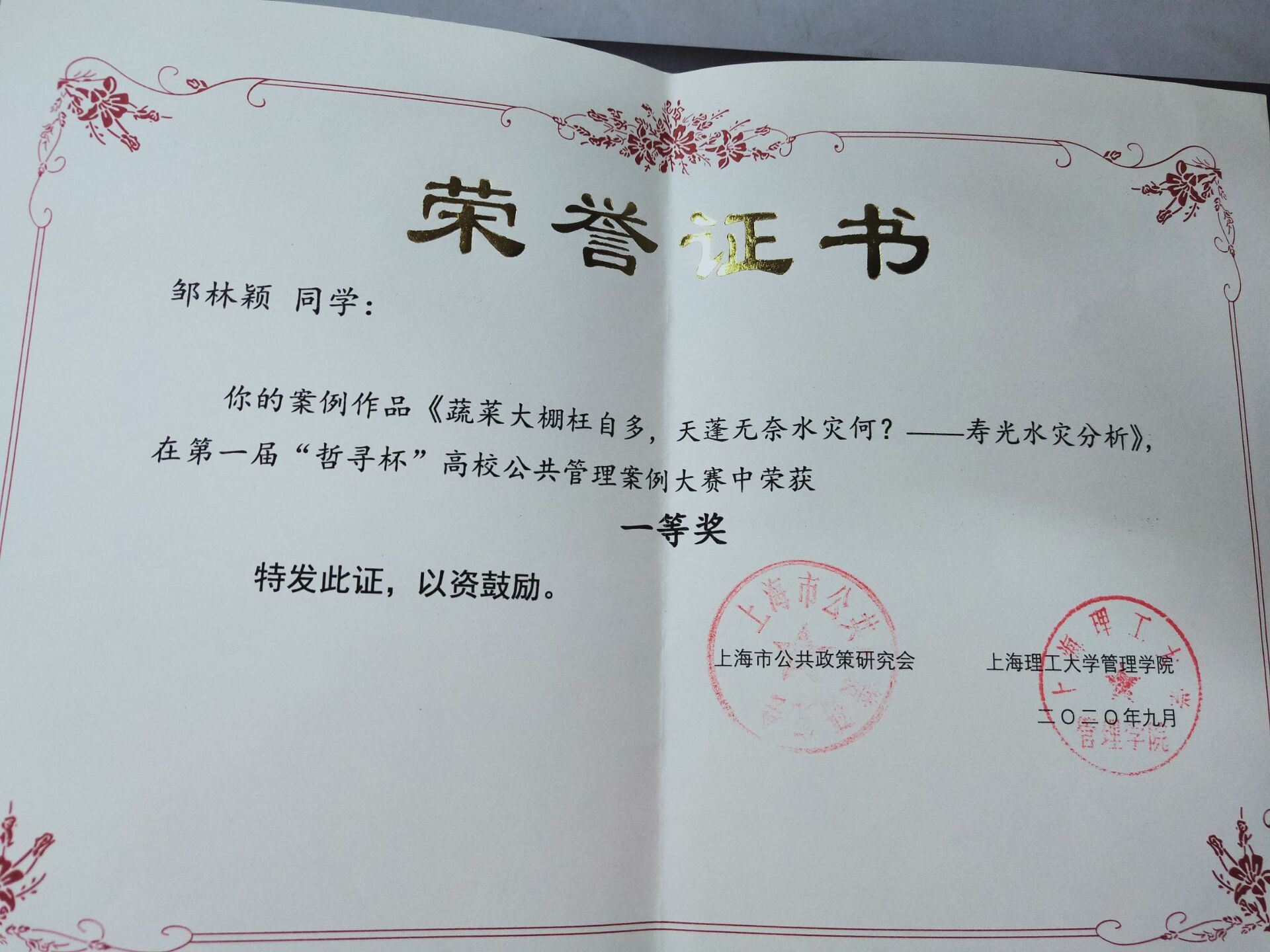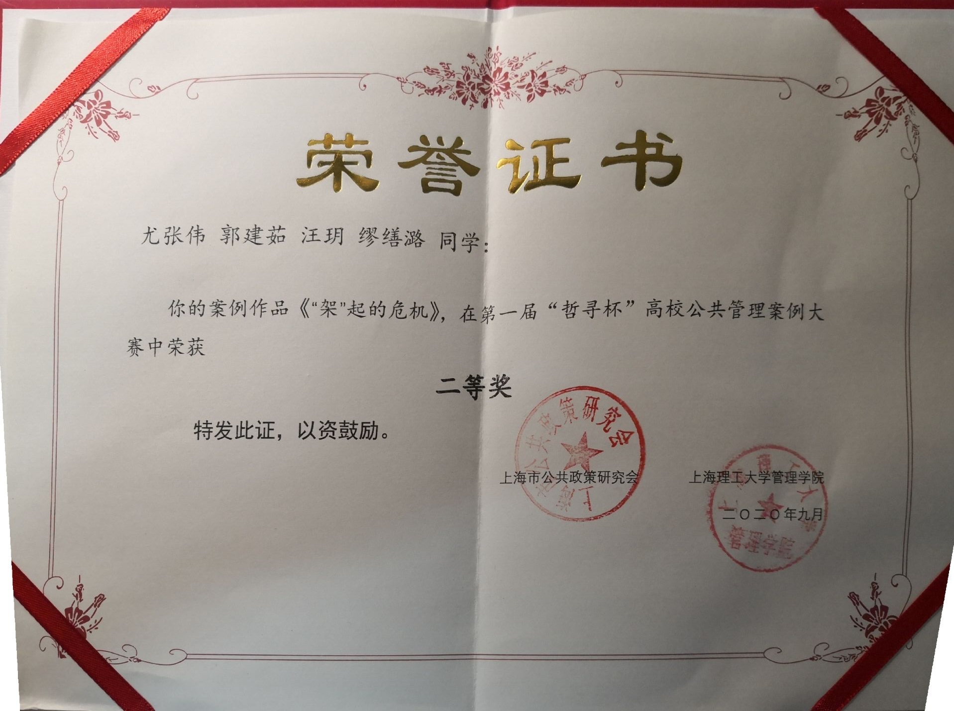 第一届“哲寻杯”高校公共管理案例大赛由上海市公共政策研究会主办,上海理工大学、上海海关公司承办,上海哲寻科技有限公司赞助。全国有三百多所高校参加这次学科案例大赛,经过激烈角逐,最终有45支参赛队进入决赛,公司公管1171班刘屹东、陈洁兴、陈旭、刘孝兰、邹林颖同学组建的参赛队进入决赛,荣获一等奖。