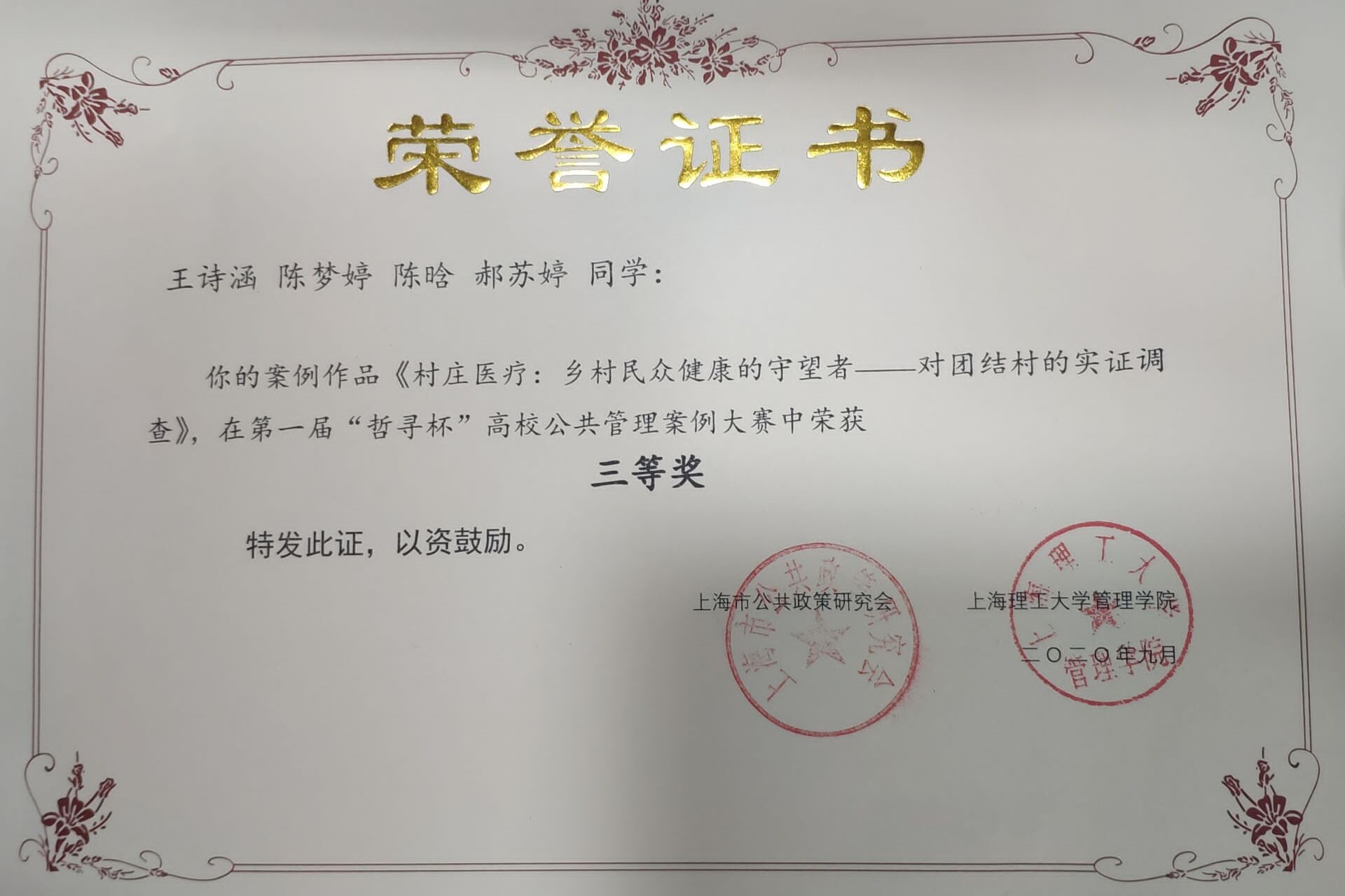 公管1181班王诗涵、陈梦婷、陈晗、郝苏婷同学组建的参赛队获得三等奖;另外有五支参赛队获得优秀奖。