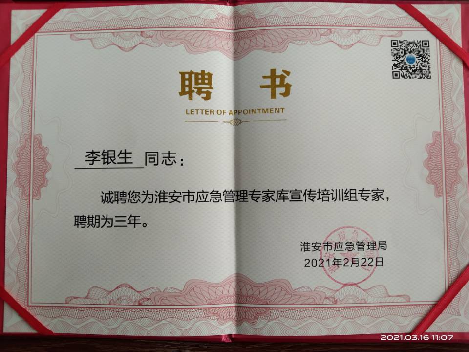 2021年3月16日淮安市应急管理局向XCsports公管系教师李银生颁发聘书,该同志入选淮安市应急管理专家库。