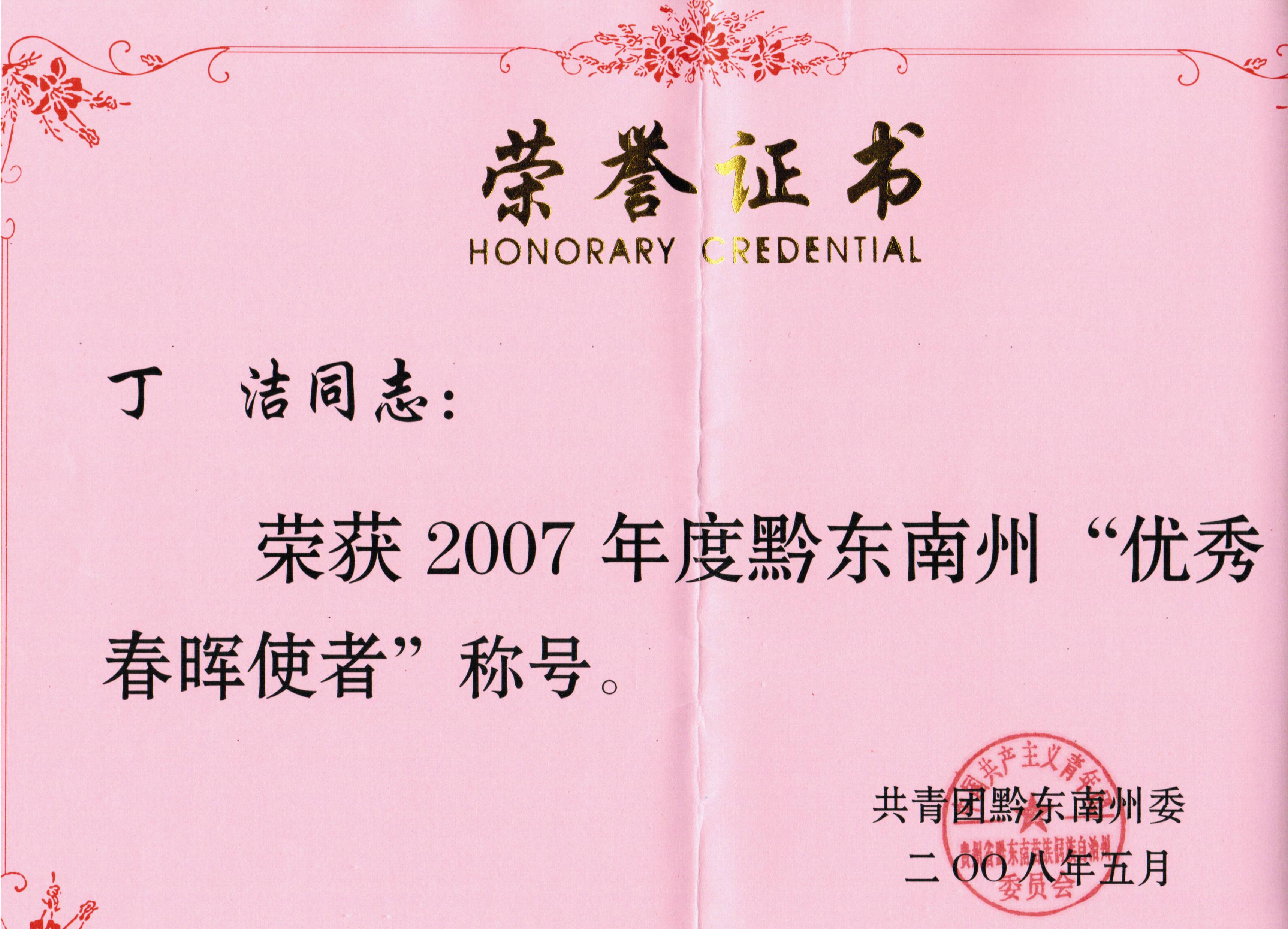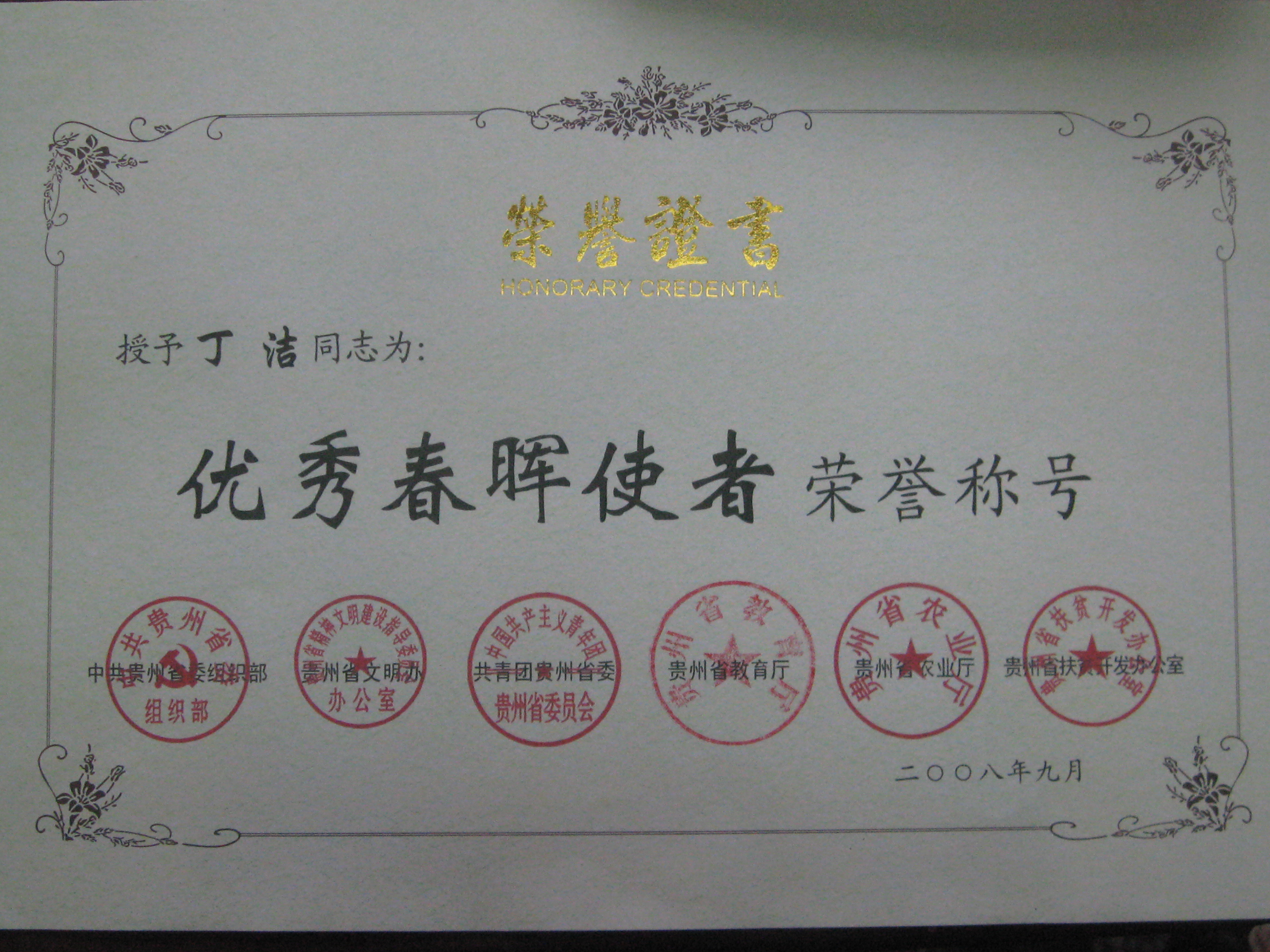 丁洁,男,出生于1985年,中共党员,江苏常州人。2007年毕业于江苏省XC体育,同年参加老员工志愿服务西部计划。先后服务于贵州省前东南州天柱县竹林乡党政办和龙塘小学,担任天柱县“西部计划”志愿者团支部书记。先后荣获贵州省前东南州“优秀志愿者”和“优秀春晖使者”称号,并获得贵州省“优秀春晖使者”荣誉表彰。他以热情饱满的心态投入到当地的计划生育、消防安检、换届选举以及林权制度改革等工作中去。他带头为龙塘小学的重建贡献了他的绵薄之力:带头并发动捐赠建设图书馆;修复、使用远程教育系统,为大山里带来了新的声音和知识;以现代化的传播方式发动社会各界重建校舍,同时也重建了希望。与孩子、教职工和乡亲们同疾苦、共发展,同他们建立了深厚的感情,也传播了志愿者的服务精神。一盏小小的灯火,温暖了大山,也照亮了希望。