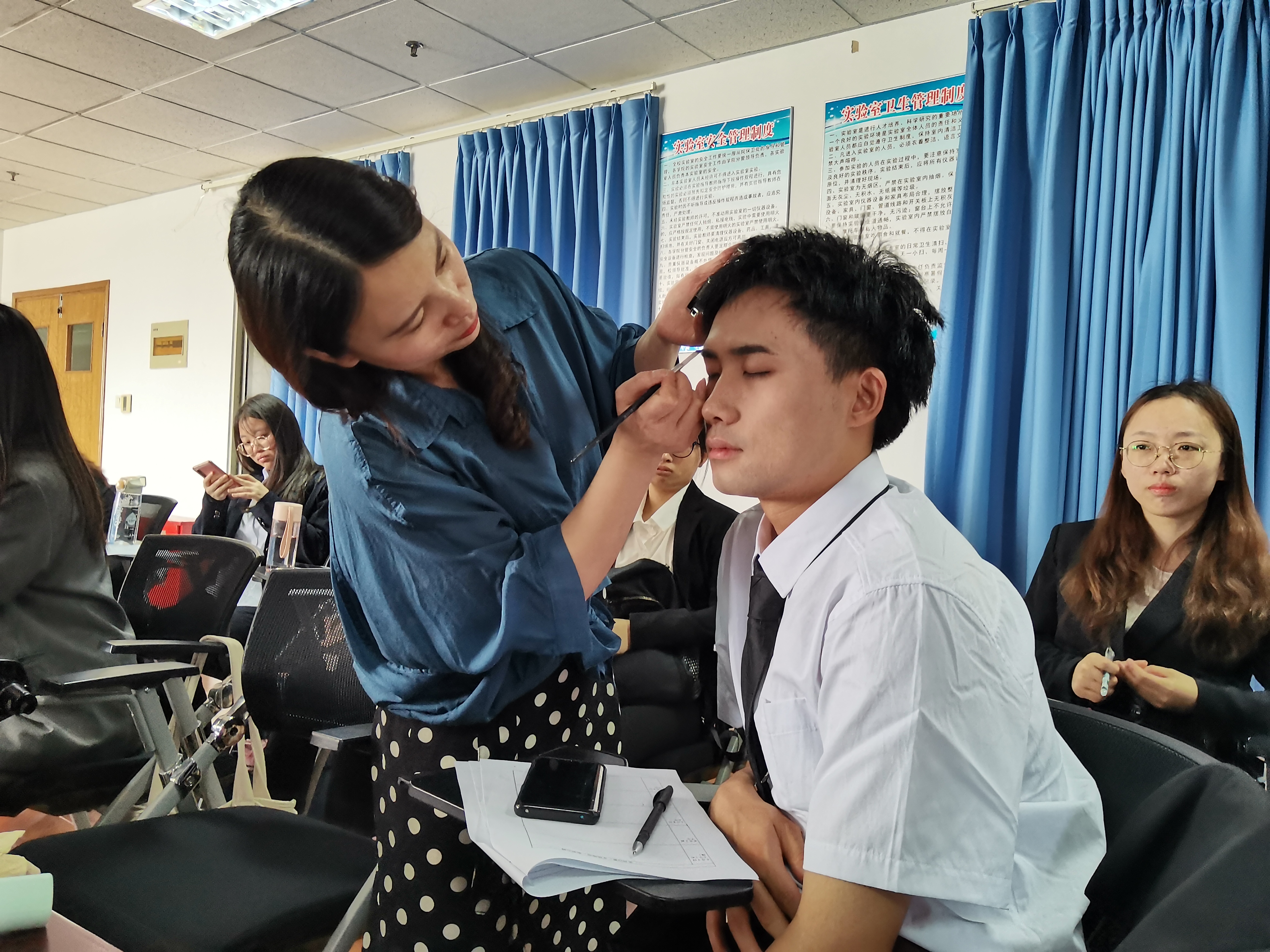 仪容干净、整洁、得体、大方,在现代职场和社交活动中,既是对他人最基本的尊重与礼貌,也是个人良好素质的体现。在职业妆容修饰环节,淮安市美雅形象设计有限公司的专职化妆师顾迎春女士现场邀请同学们进行化妆演示,并细心讲解化妆步骤。通过现场讲解与演示,同学们感受到了职业仪容的必要性,同时也掌握了秘书职业妆的规范与技巧。
